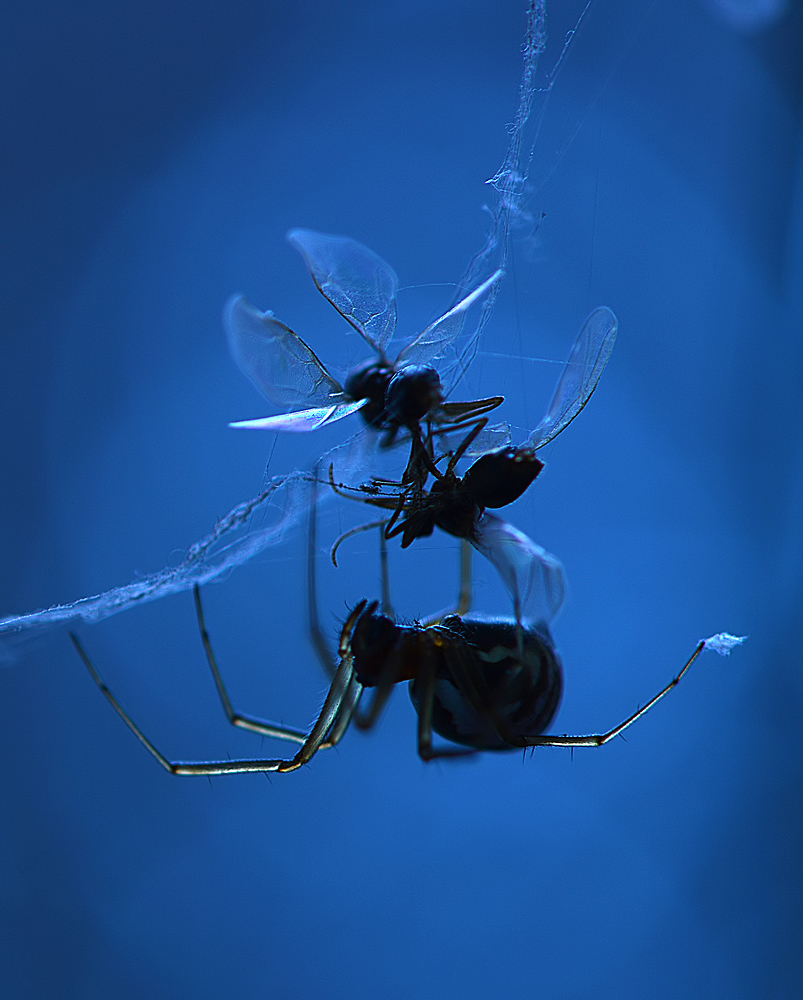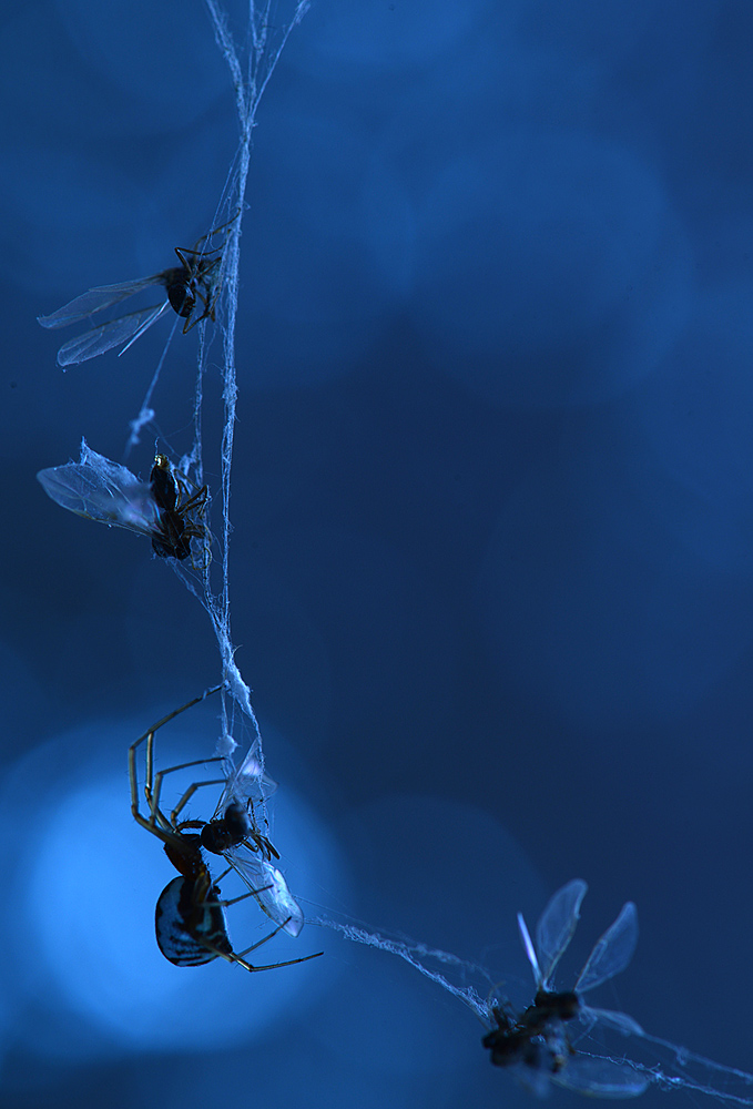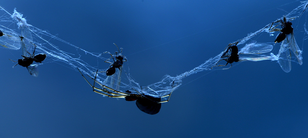 Вечером начался лет муравьев. Потом пошел дождь, который разорвал паутину, на которую прилипли муравьи. Подсветив синим фонариком, мне удалось сделать несколько кадров.