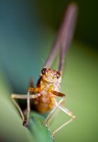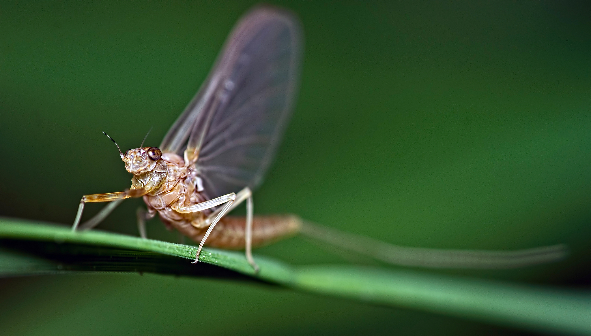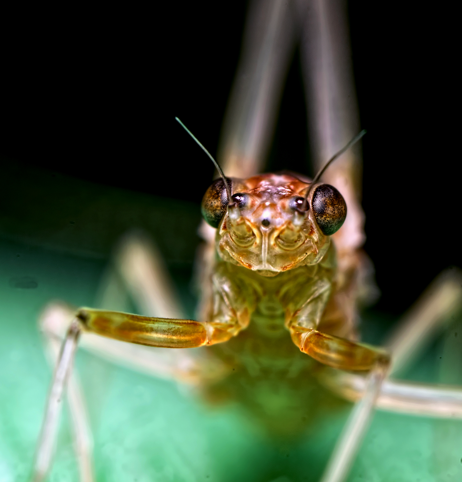 Сначала на травинке ,а потом она перелетела мне на живот, на зелёную майку