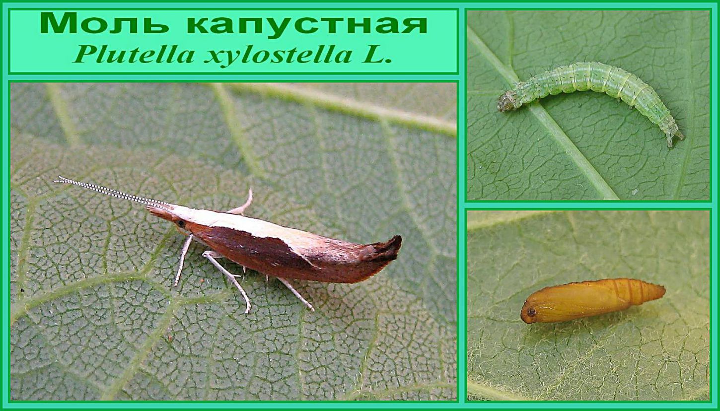 на фото изображены бабочка, гусеница и куколка моли капустной