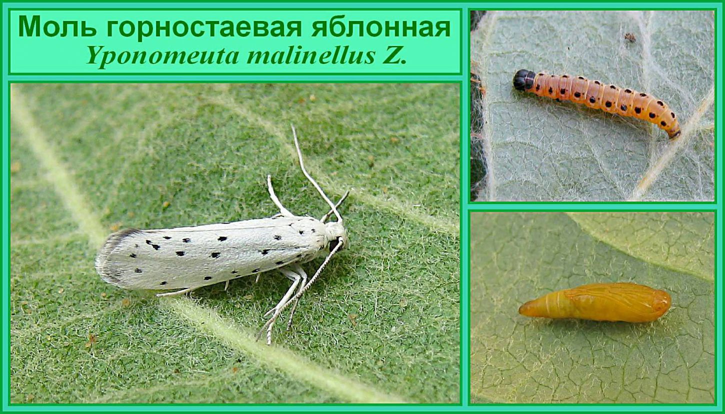Каждый раз, когда смотрю на такие подборки, мне не хватает какой-то фотографии, которая бы показывала, как обнаружить его в природе. В самом деле, ведь эту моль никогда не встретишь в стадии куколки, лежащей на лопушке. Также и гусеницу. Только бабочку - может быть, но не часто. Зато нельзя не заметить паутинные гнезда на ветках, а в них вот этих самых гусениц и куколок. ...