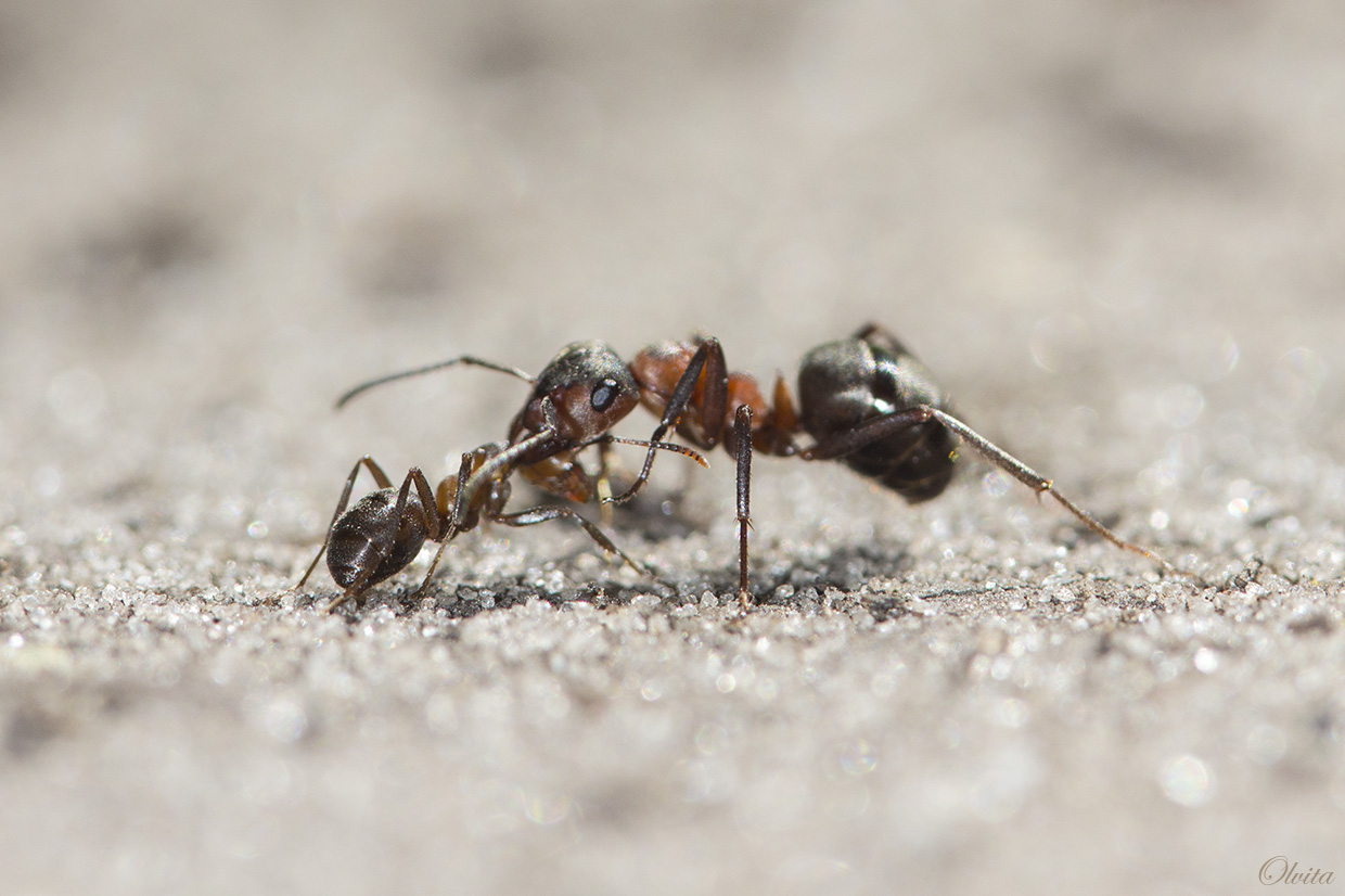 Понимаю тех, кто не решился поучаствовать в муравьином блице - с ними не так-то просто с непривычки... Хорошо, что попался муравейник у самой тропинки, и можно было понаблюдать достаточно спокойно за работой этих маленьких шустрых трудяг. Но плохо, что по тропинке довольно оживлённое движение гуляющего народа, и не все мураши успешно попадают домой... Между данными двумя героями снимка происходило какое-то непонятное взаимодействие - то-ли воспитание, то-ли борьба, то-ли ещё чего?