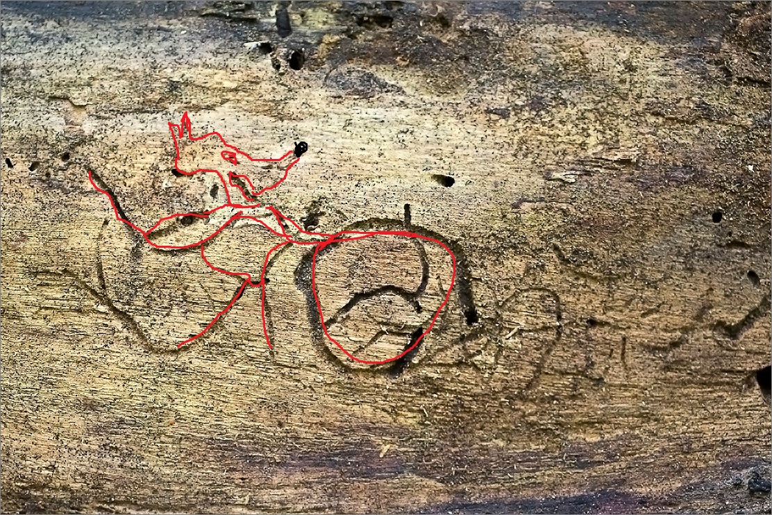 Бревно, неизвестно уже какого дерева, много лет лежит в ГБС, на дорожке от теплиц до маковой поляны. Никогда , раньше, не обращала на него внимания. На нем много интересной жукописи, но к сожалению, она почти вся зарисована фломастерами.