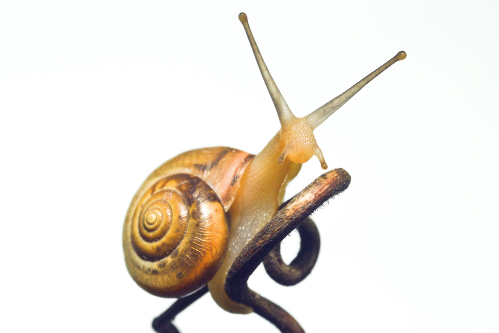 Улитку, ползущую через через дорожку в саду, принес в дом. Посадил на завитушку от виноградной лозы и попросил попозировать для фото. Вернул обратно в природные условия и выбирая удачные кадры, обнаружил этот. Название пришло в голову само, поскольку улитка с "ножками" действительно чем-то напоминала доисторическое животное.