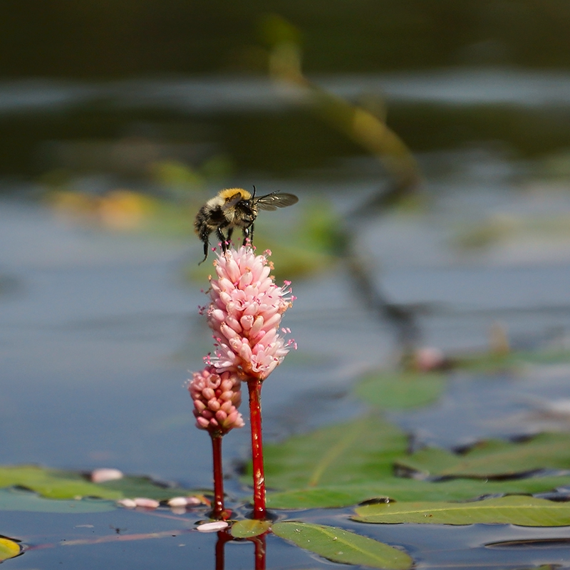 Цветки земноводного горца (Горец земноводный, Persicaria amphibia, Polygonaceae), наполненные нектаром и пыльцой, - вполне основательная причина попорхать над самой водой!
