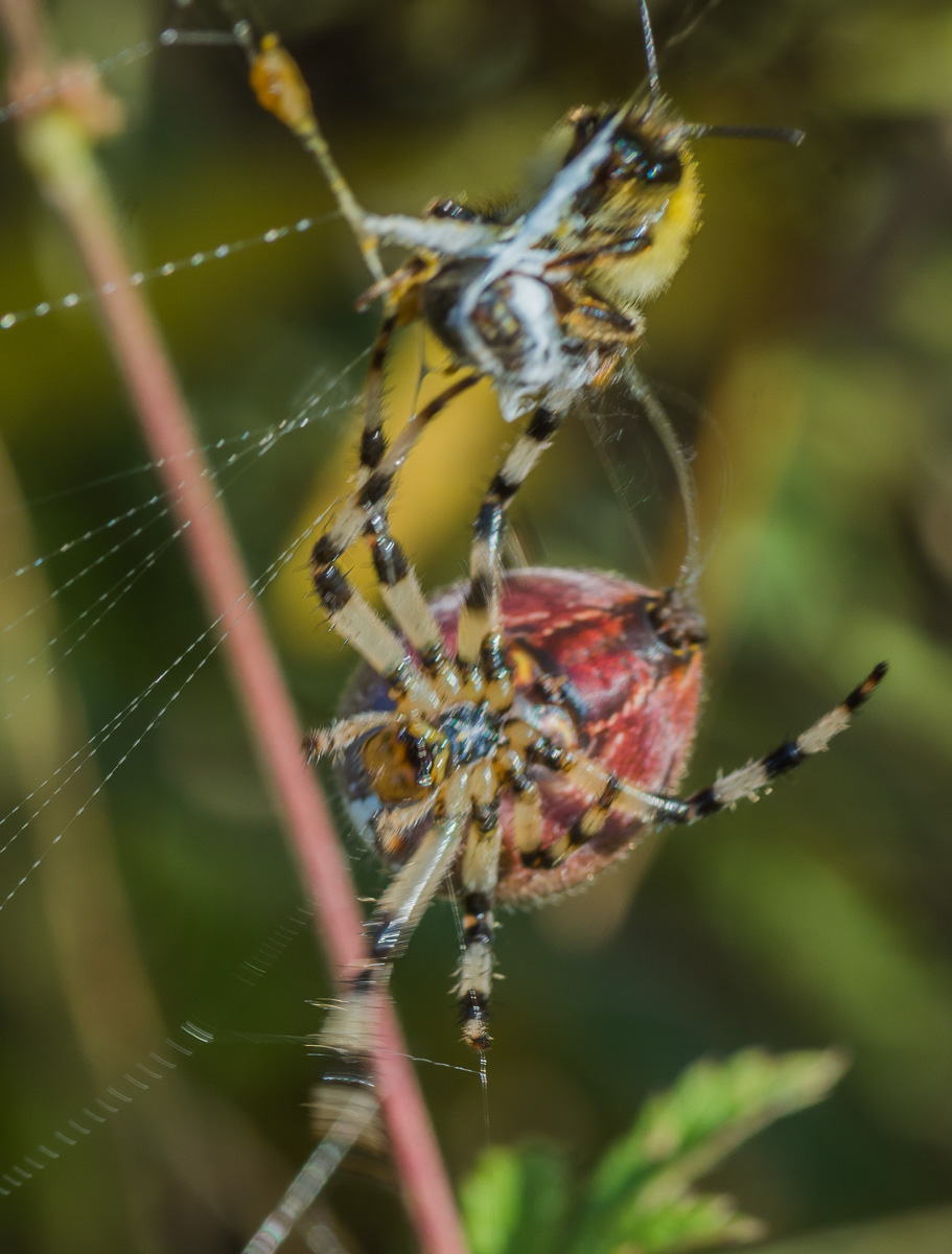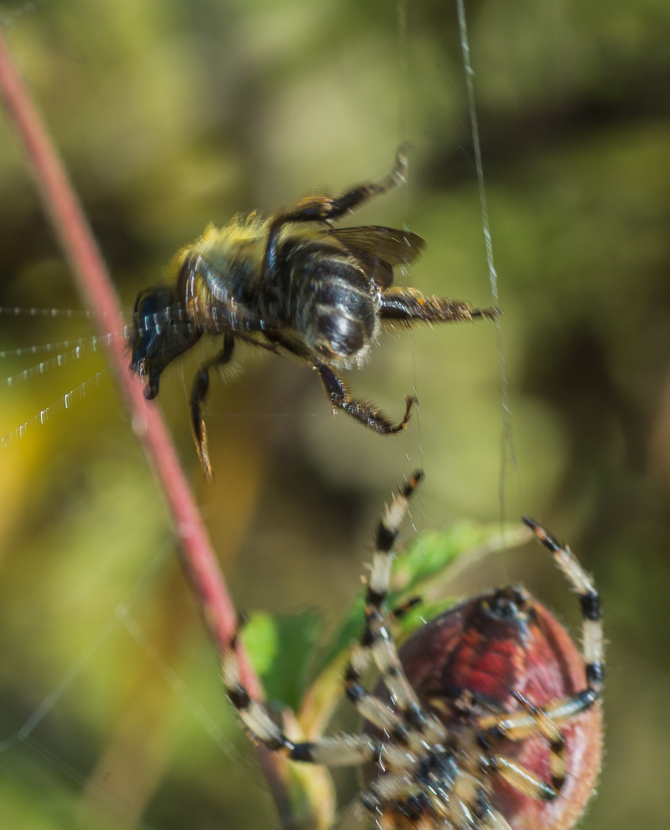 Вот такую сценку наблюдала я впервые! Пчела отчаянно боролась за свою жизнь, вырвалась из лап паука и из паутины и улетела... Понимаю, что не все фото отличного качества, просто все происходило очень быстро...