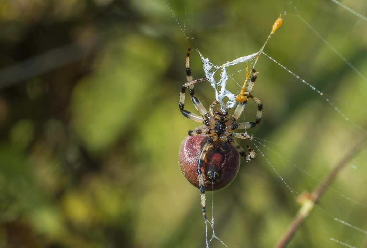 Никогда не думала, что пауки едят пыльцу, это осталось на паутине с лапок пчелы.