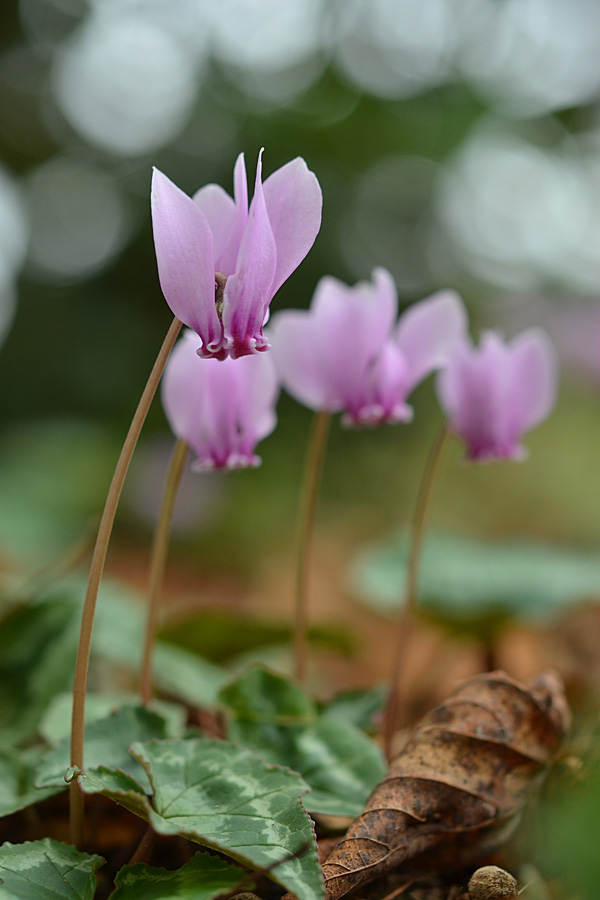 Привык видеть цикламены в горшках, которые большие и разного цвета. Когда то видел цикламены в районе Сочи, там были маленькие, но по моему побольше этих и цвели в марте. Эти совсем маленькие и цветут сейчас, осенью. Я около этих деревьев весной хохлатки снимал и летом ходил, думаю если бы цвели то заметил. Видимо какой то осенний вид. Табличек не было .