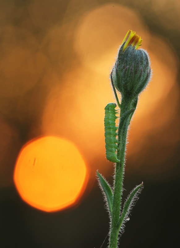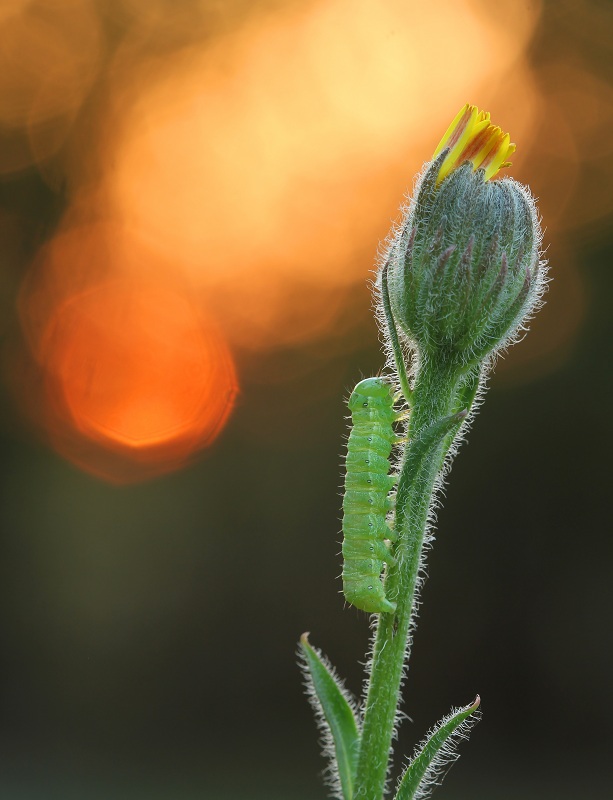 Такая же, как на предыдущем кадре, гусеница, но уже на другом растении.