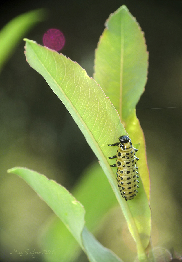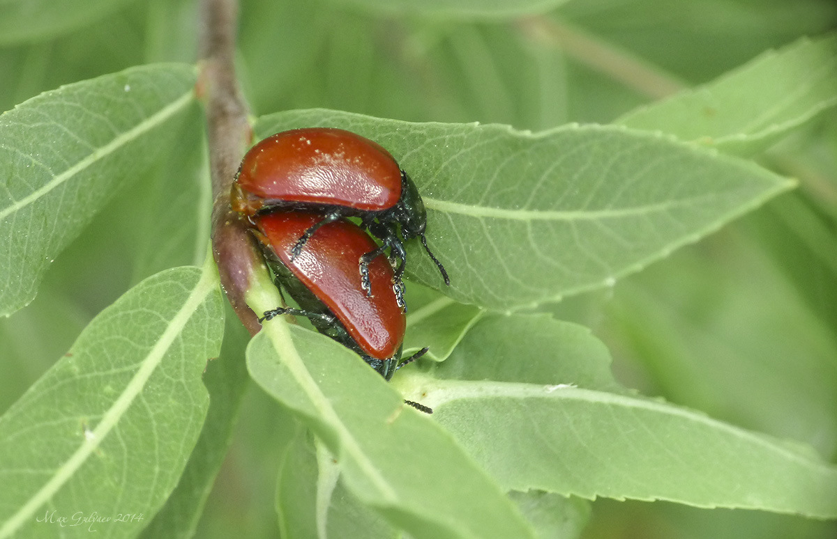 Есть на бережку речки Бельбек, что в Ольвитиных угодьях, одно замечательное место, густо заросшее маленькими кустиками ивы и всякой другой растительностью. Там мы находили гусениц гарпии, там вообще можно много чего найти. В том числе и ивовых листоедов, Chrysomela saliceti. Притом сразу все поколения.