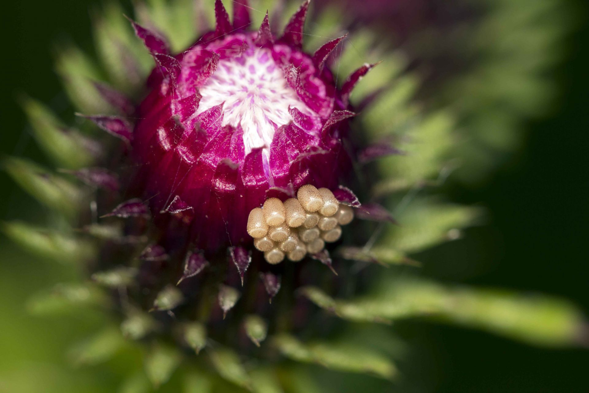 Это кладка клопа из семейства Щитники настоящие - Pentatomidae.
