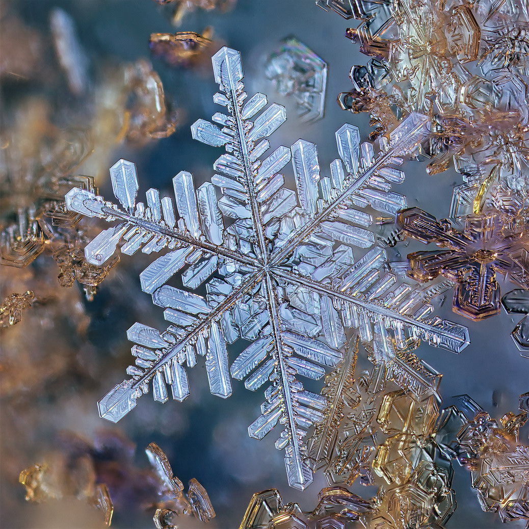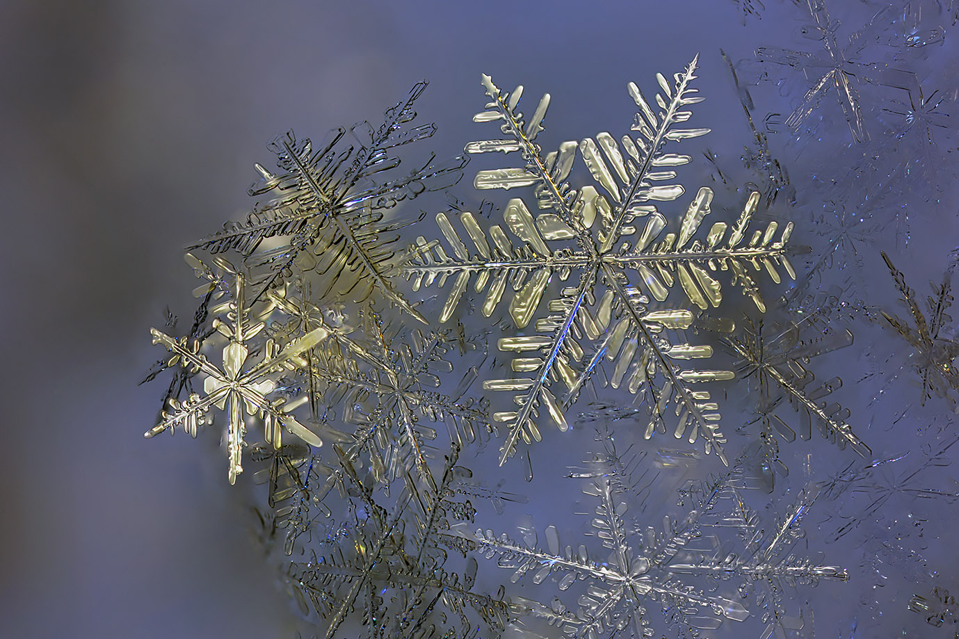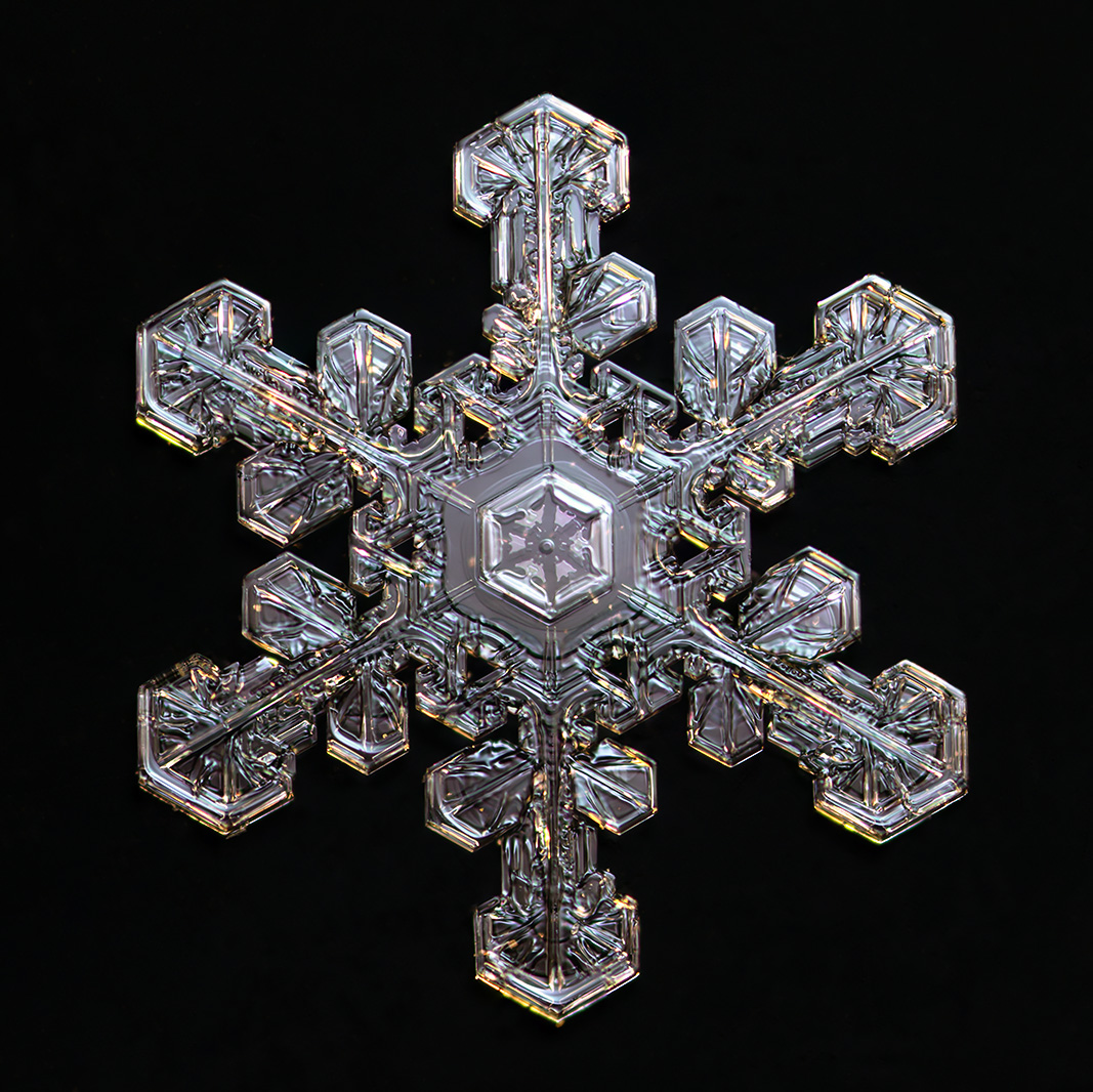 В прошлом году удалось раскрасить снежинки. Использовался осветитель, подобный описанному в статье http://macroclub.ru/how/polarizer . Источником света был светодиодный прожектор, поляризатор круговой и развернут четверть-волновой пластинкой наружу, на объективе поляризационный фильтр. Отраженные, преломленные, рассеянные лучи имеют разные фазовые сдвиги, поэтому окрашиваются по разному. Возмоно какой-то цветной вклад дает двойное лучепреломление льда.