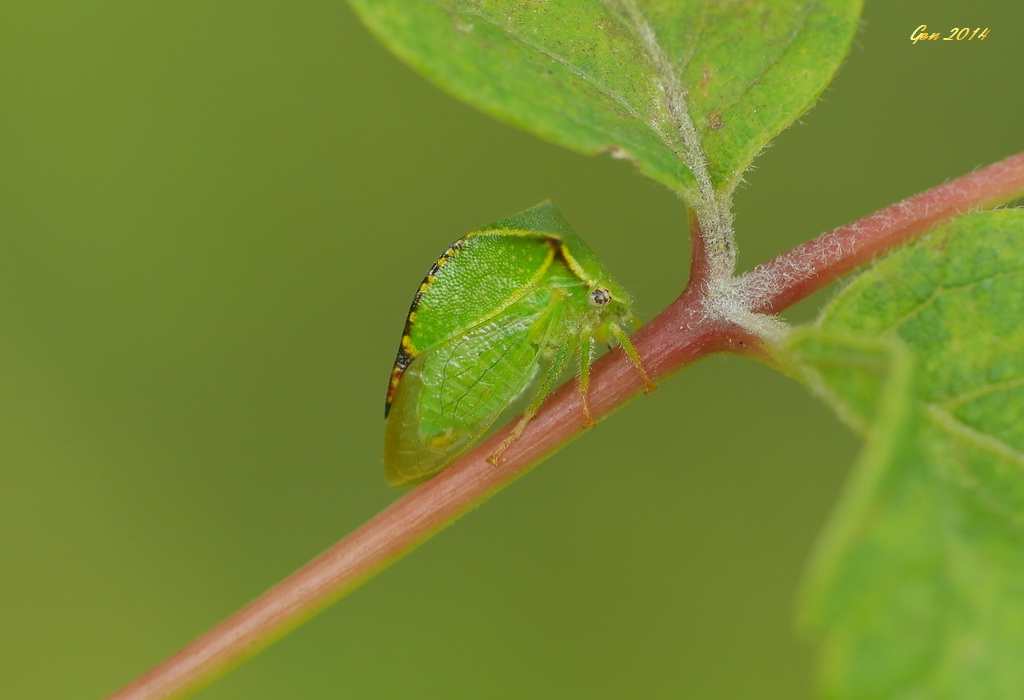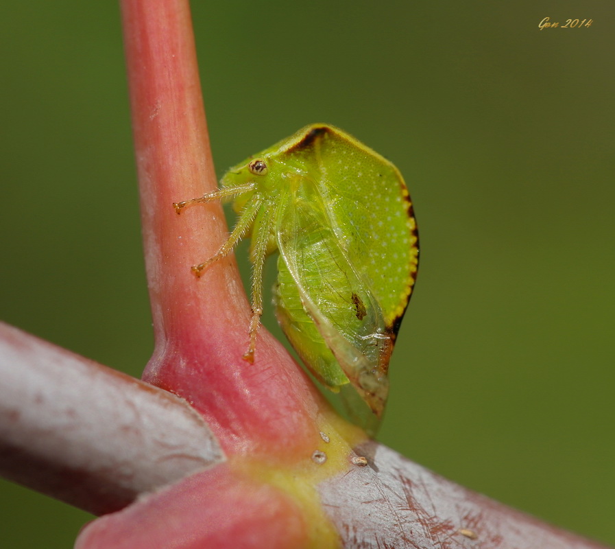 Stictocephala bisonia - бодушка бизонья. Одна из моих любимых модлей. В прошлом году удалось сделать довольно много снимков. Этот американский вселенец держится другого "американца" или в его окрестностях - клёна ясенелистного, или американского (Acer negundo), который широко ипользовался при озеленении города, а теперь сам распространяется. И питаются (хотя не только на нем) и яйца откладывают (яйцекладущих на других растениях пока не наблюдал).