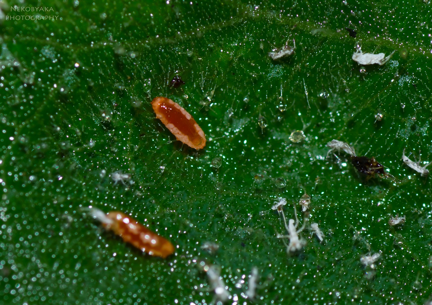 Непонятные оранжевые насекомыши были обнаружены среди тли и личинок божьей коровки. В передвижении замечены не были. Только недовольно вставали "по стойке смирно" от вспышки ) Что это может быть за живность?