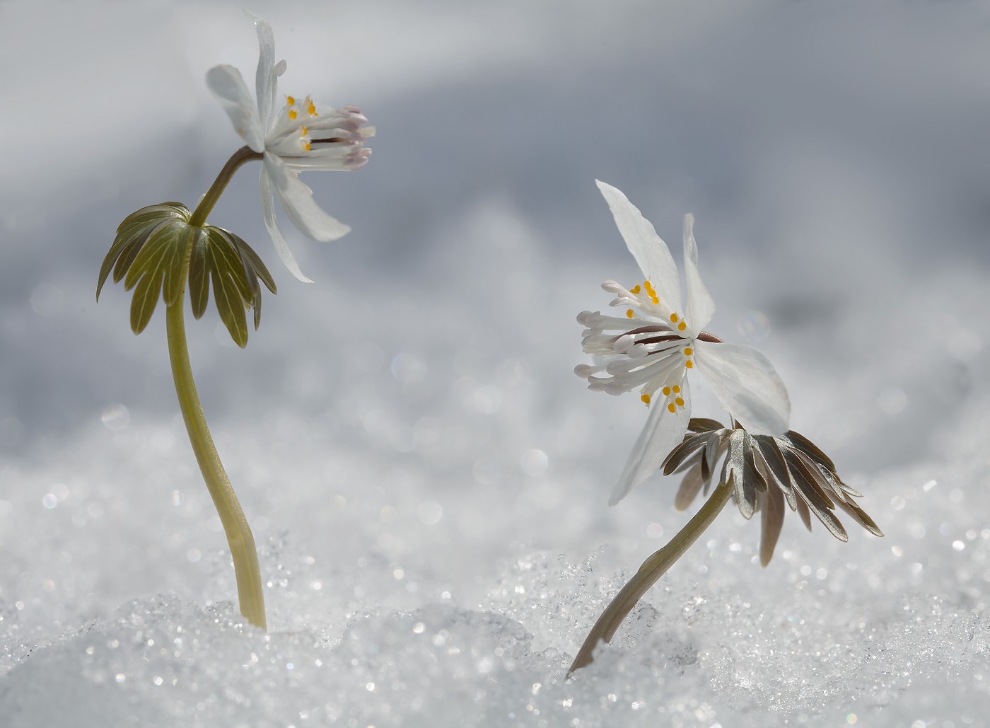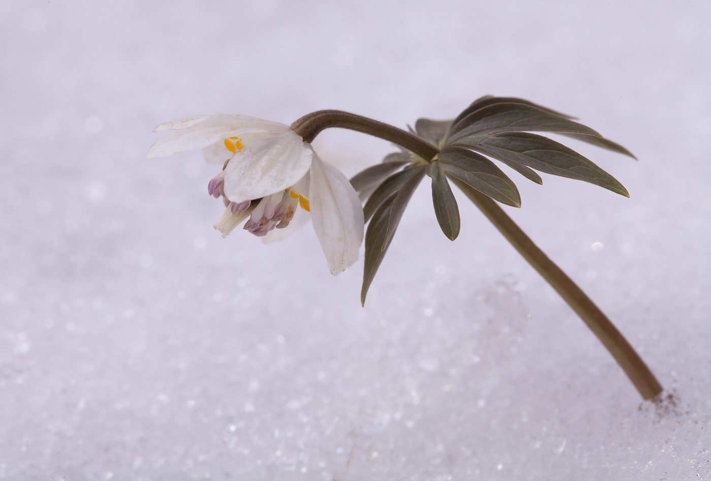 Но, как это часто бывает в апреле-налетел циклон и все опять засыпал снегом. Все цветы оказались в снегу. Большая часть оказалась полностью засыпанными. Лишь под крупными хвойными деревьями, которые задержали снег, некоторые растения остались на поверхности.