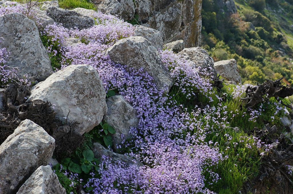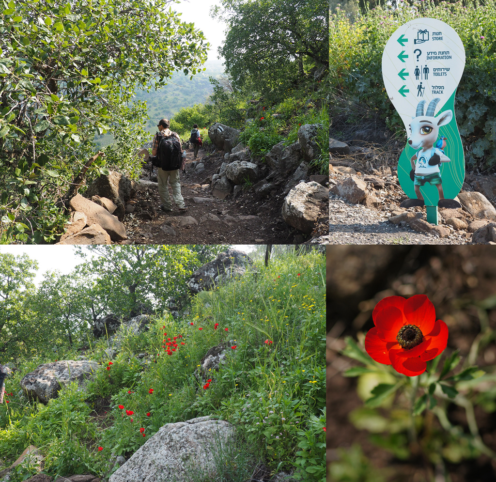 Как уже повелось, зашли в парк первыми. А значит, есть шанс встретить на пути каких-нибудь еще не распуганных местных обитателей. Тропа идет вниз, спускаясь в долину реки Мешушим. Склоны пышны и живописны: деревья, кустарники, цветущие луга, цветущие камни – пестрые за счет разноцветных лишайников. На камнях сидят симпатичные ящерки. Ну уж очень пугливы и шустры. Мне они так и не дались. И много мимикрического макро. Гусеницы притворялись сухими веточками, акриды – травинками, кобылки - камушками и пупырчатыми лишайниками. Эх, попастись бы тут с этой точки зрения, да помакрушничать вдумчиво и всласть!