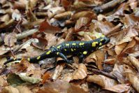Вот пример оцифрованного слайда. Это пятнистая, или огненная, саламандра (Salamandra salamandra) — наиболее известный и широко распространенный вид, населяющий Среднюю и Южную Европу, Северную Африку (Алжир, Марокко) и западную часть Малой Азии. В пределах бывшего СССР встречается в западных частях Украины, где обитает в горных и предгорных районах Карпат. Снял я её практически в центре города Косова. Есть в этом городе гора, поросшая лесом, которая так и называется Городской горой. Встретил я саламандру при весьма трагических обстоятельствах — в лесу темно, а счётчик кадров показывал, что в аппарате отснято уже 36 кадров. Надежда была на то, что удастся отснять 37-й кадр. Так что о художественности думать не приходилось, снимал лишь как фотофакт. Снято 42 года назад!