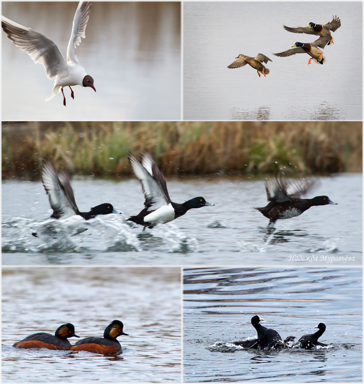 А птички, тем временем, не обращая на нас особого внимания (ну, ясное дело: они же тут хозяева), жили своей обычной жизнью: чайки искали, что бы поесть (и Юра не обманывал их надежд, время от времени доставая их своего неизменного пакета с надписью "Богатырь" пару кусков хлеба, и, как сеятель, разбрасывая крошки по воде), кряквы выбирали невесту, лысухи устраивали брачные турниры, хохлатая чернеть ходила стайками, и только пара черношейных поганок уже определившись в своих привязанностях, мирно и синхронно дефилировала туда-сюда, не включаясь во всеобщую суету.
