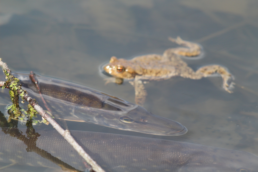 И, к моему изумлению, я увидел у самого берега (от силы в полутора метрах от меня) торчавшую из воды щучью спину! На мелководье затаилась щука, причем уже на фото стало видно, что не одна, просто вторая не торчала из воды. И бестолковый жаб решил, что щука неплохо подойдет ему в подружки - как я уже писал, кидались они на все мокрое и блестящее (а еще на все, что двигалось).