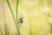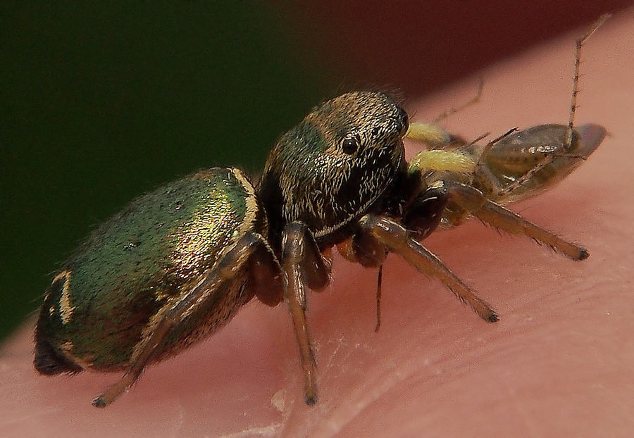 Некоторые пауки довольно опасны. А такие как "чёрная вдова"- могут быть смертельно опасны для человека. Вряд ли такой крошечный скакун может представлять потенциальную угрозу. Тем более-занятый добычей. Впрочем, у меня пару раз были подобные же случаи, именно с пауками-скакунами. Ищешь-ищешь паука на траве-глянешь случайно на себя, а он уже на рукаве или, вообще, на тыльной стороне ладони сидит ...