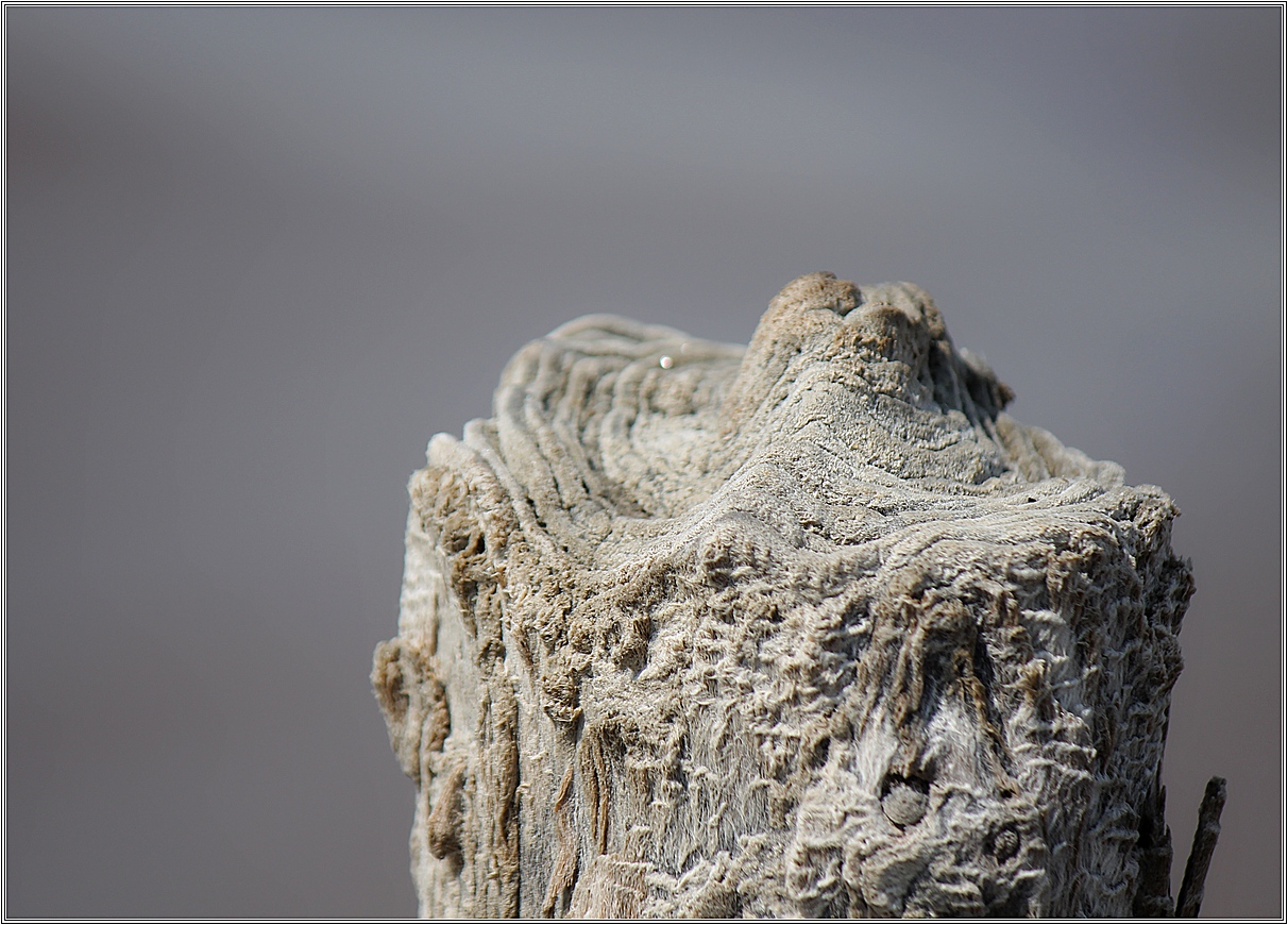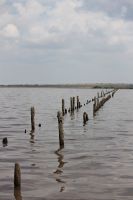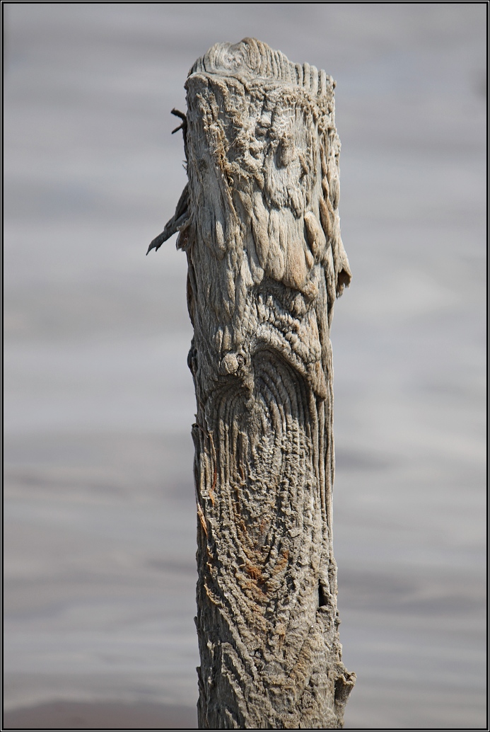 Множество сдвоенных рядов деревянных столбиков, вбитых в дно Куяльника, длинными вереницами причудливых фигур тянутся к горизонту в разных направлениях. Признаться, назначения их я так до сих пор и не узнала. Но каждый из них, изъеденных годами пребывания в четырёх стихиях, пропитанный солеными водами, овеянный тысячами ветров, высушиваемый солнцем и вновь пропитывающийся водой и солью, бесконечно изменяющийся - становится ПРОИЗВЕДЕНИЕМ (тут, конечно, не скажешь "искусства", а что тут скажешь?) . Вот только один из них.
