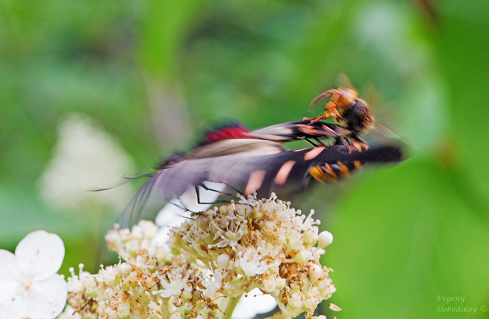 В довесок (последний кадр)-нападение осы (похоже шершня) на самку Алциноя. Выдержка была длинной-1/200 поэтому сильно смазано. Просто, как констатация факта. Бабочка благополучно смылась.