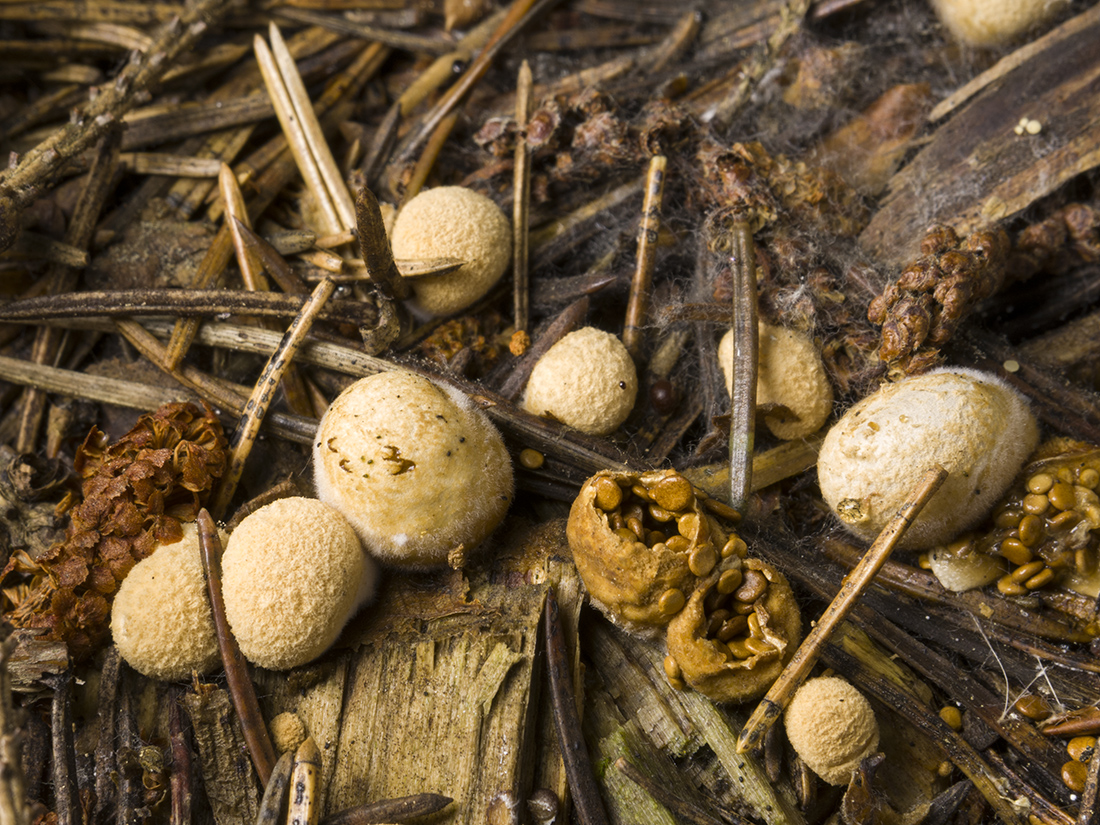 Среди обычных (гладких и полосатых) грибов-бокальчиков заметил каких-то ранее мне не встречавшихся. Они похожи на маленькие грибы-дождевики. За исключением того, что внутри споры как таблетки, характерные для бокальчиков. Интересно было бы узнать что это за грибы.