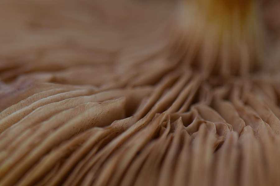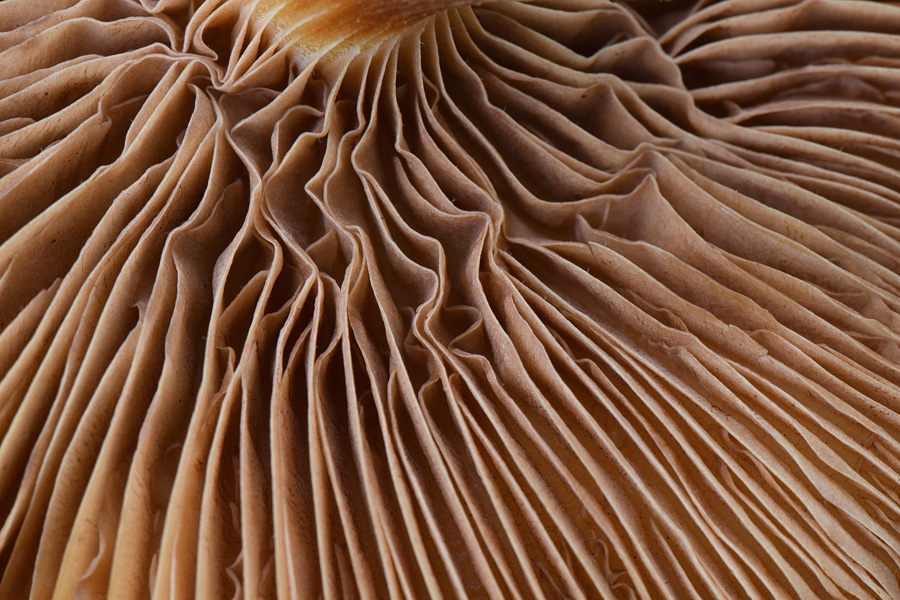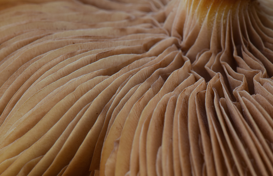 На шляпке одного из грибов в этой кучке выросли пластинки