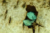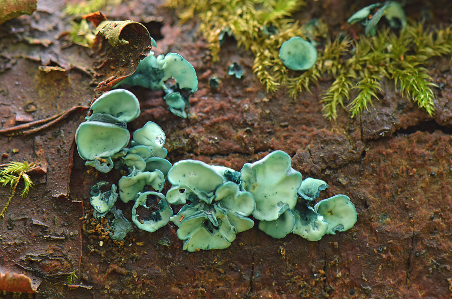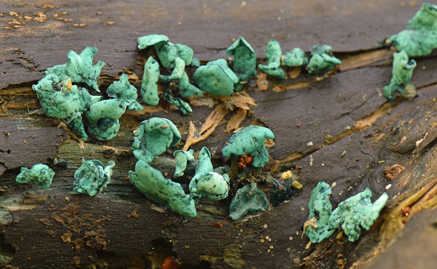 Грибы, грибы. Вот, из Википедии: "Хлороцибо́рия си́не-зеленова́тая (лат. Chlorociboria aeruginascens) — вид грибов, входящий в род Хлороцибория (Chlorociboria) семейства Гелоциевые (Helotiaceae)."