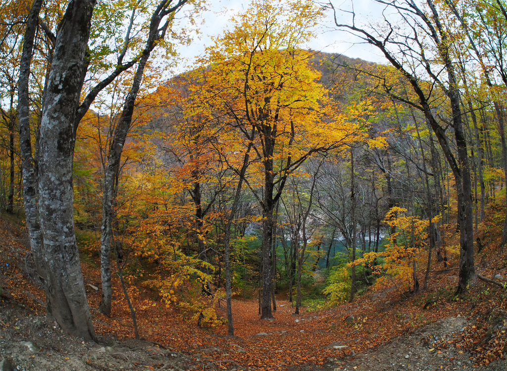 Покатались по окрестностям. Река Белая, бегущая по ущелью, оказалась вовсе не белой, а густого цвета морской волны. Ну, разве что буруны заставляли мириться с названием. А вокруг - все оттенки желтого, зеленого, красного...