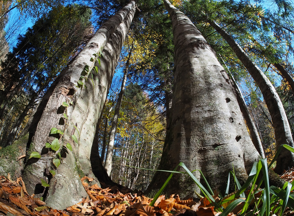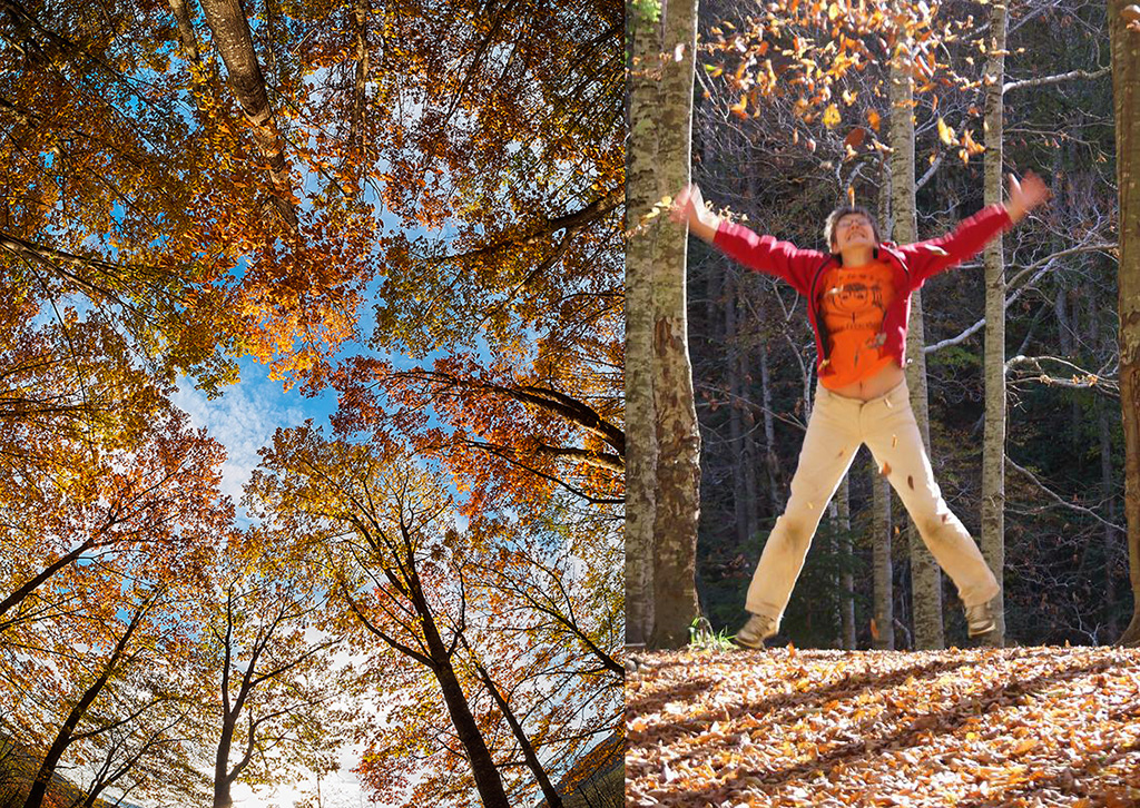 Пошуршать, поваляться, насытиться их терпким запахом, попрыгать, устроить салют... Побродить среди толстенных стволов, словно меж ног гигантских слонов с когтистыми пальцами... По некоторым снизу вверх ползут зеленые вьюны, еще не тронутые осенью. Должно быть это очень щекотно...