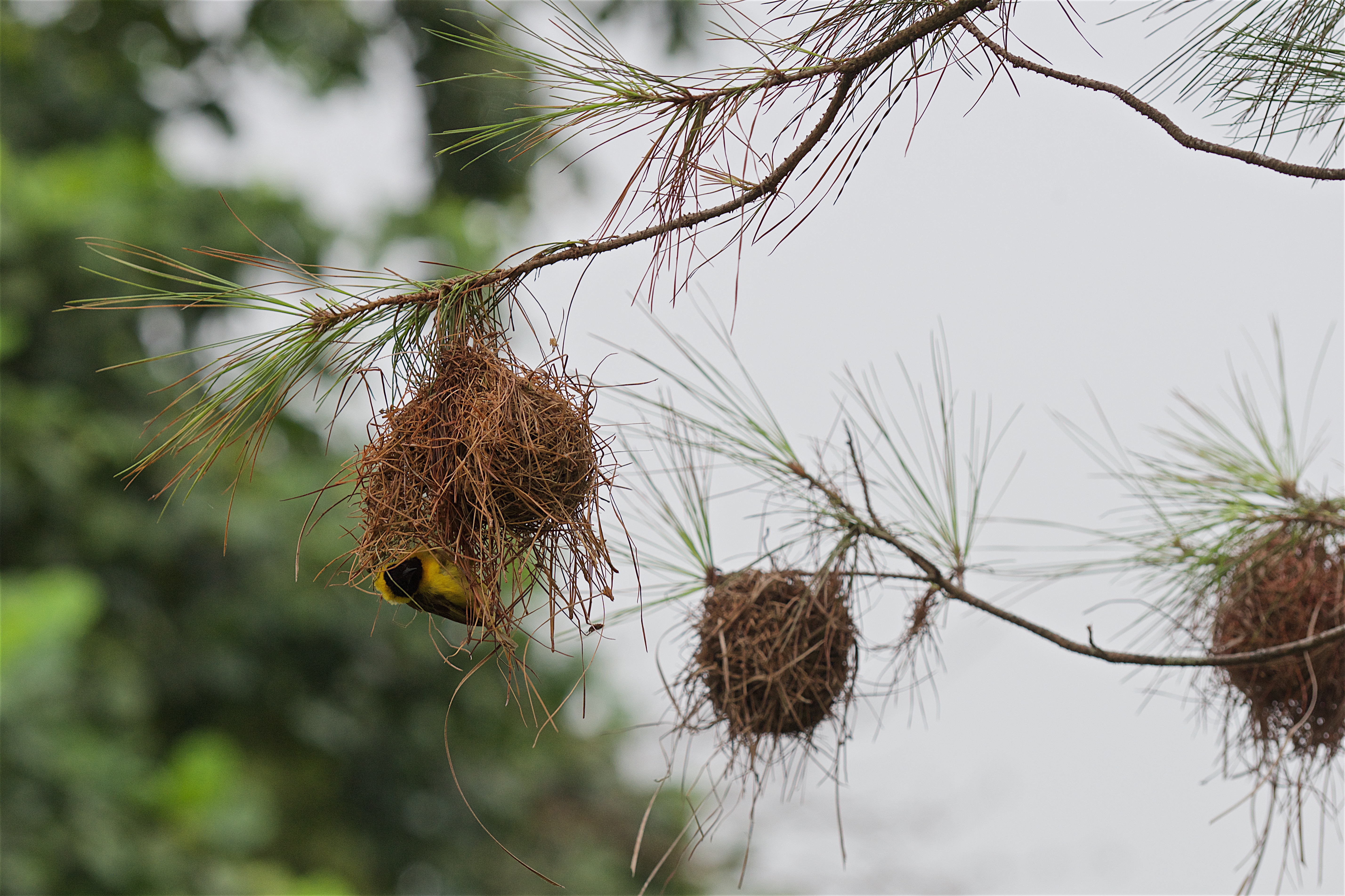 Большая колония этих маленьких птиц гнездилась на кончиках длинных листьев, дерева, похожего на пандантус.