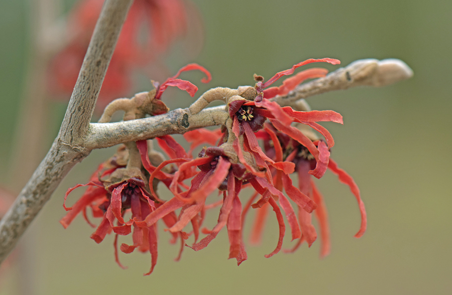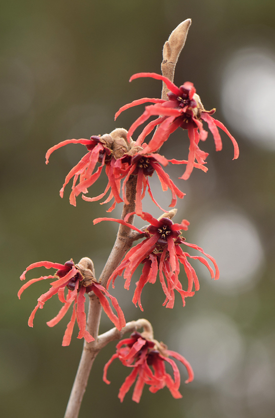 В воскресение проходя вдоль забора ботанического заметил какой то новый кустик с красными цветками похожими на Гамамелис. Возвращатся было лень и сегодня подьехал посмотреть. Похоже какой то гибридный сорт. Покопался в интернете и нашел вот такую информацию о Гамамелисах http://toptropicals.com/html/tropics/articles/rare/hamamelis.htm