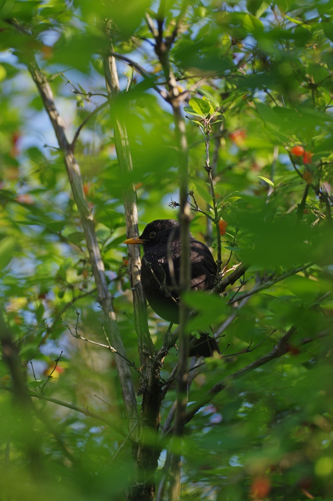 Однако нас опередили! Черный дрозд трапезничал за милу душу спелыми ягодами!