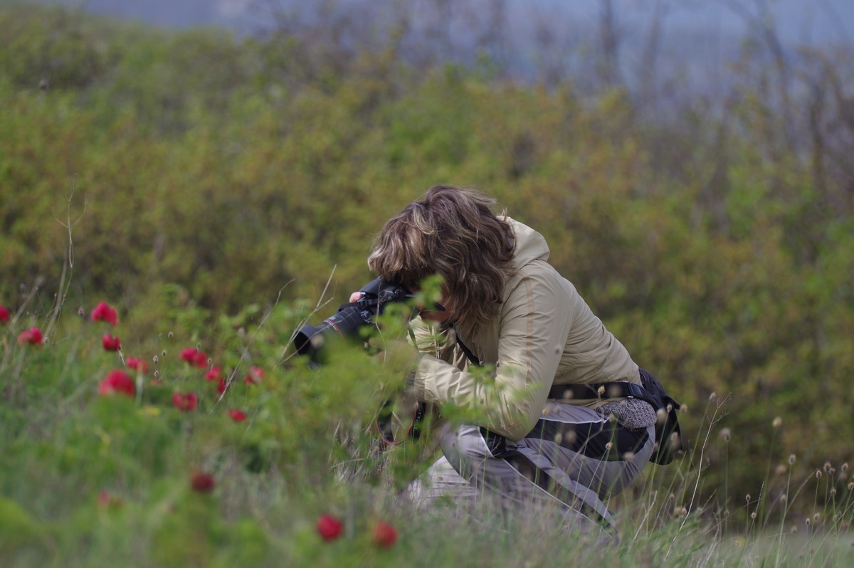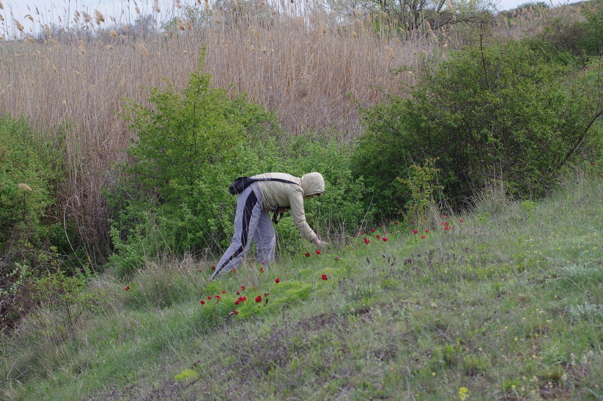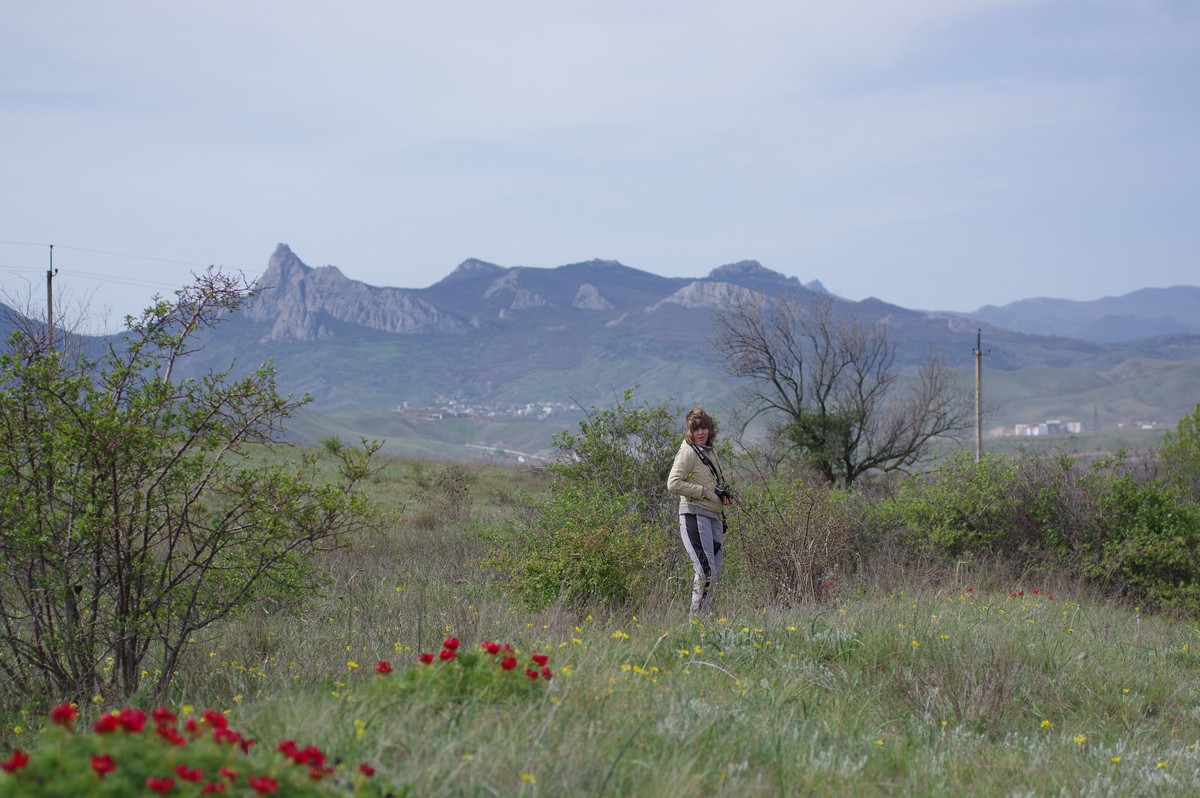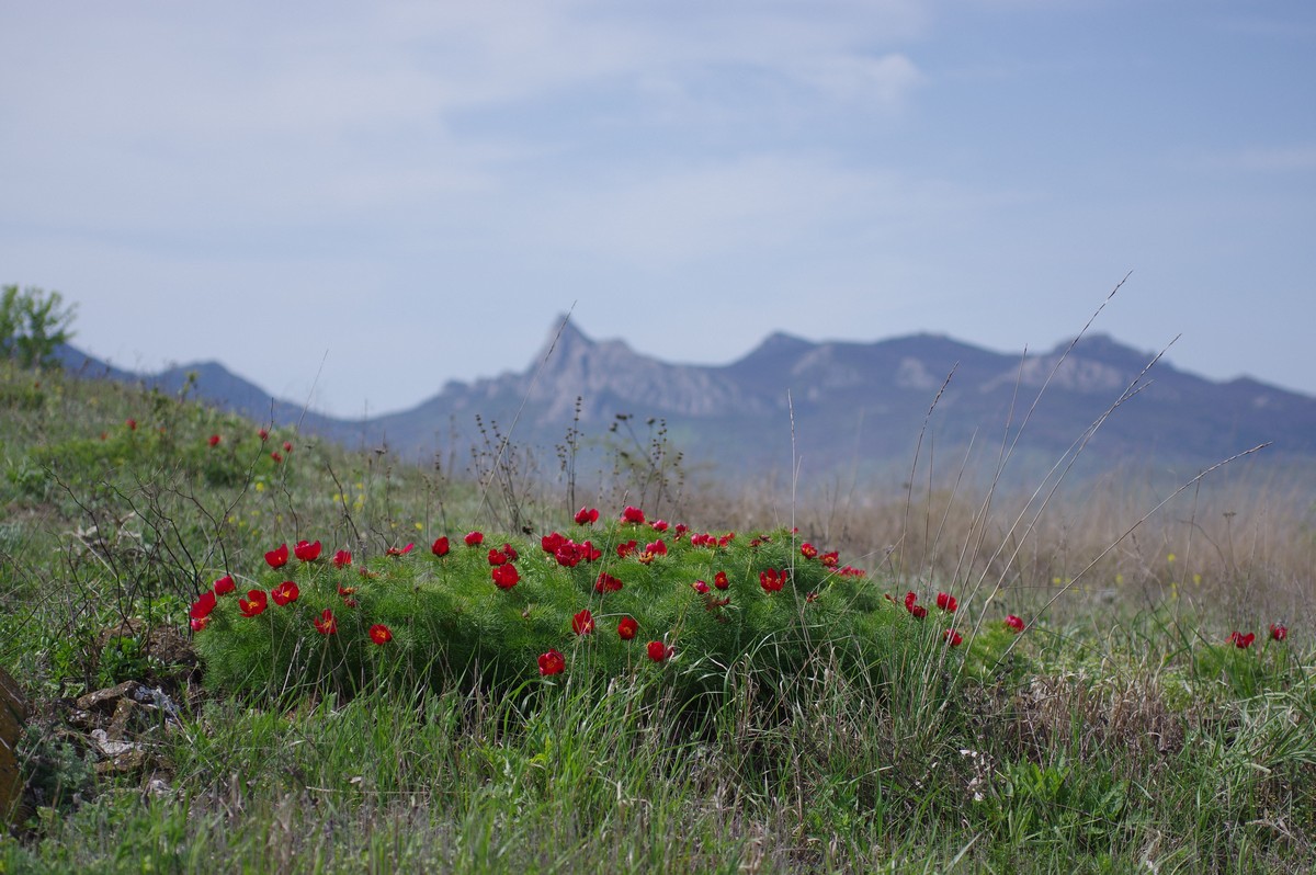 Переправа много времени не отняла и по этому уже в 8 утра мы проезжали по центральным улицам Керчи. Потом дорога на Феодосию, поворот на Коктебель и ... вот они, красавчики!!! Раскинулись по склонам придорожных холмов! Мимо проехать ну никак нельзя. Взяв снаряжение мы с Олей отправились бродить по склонам. Оля снимала пионы, я снимал пионы, Оля снимала меня, Я снимал Олю и пионы, пионы и пионы, пионы и Коктебель!