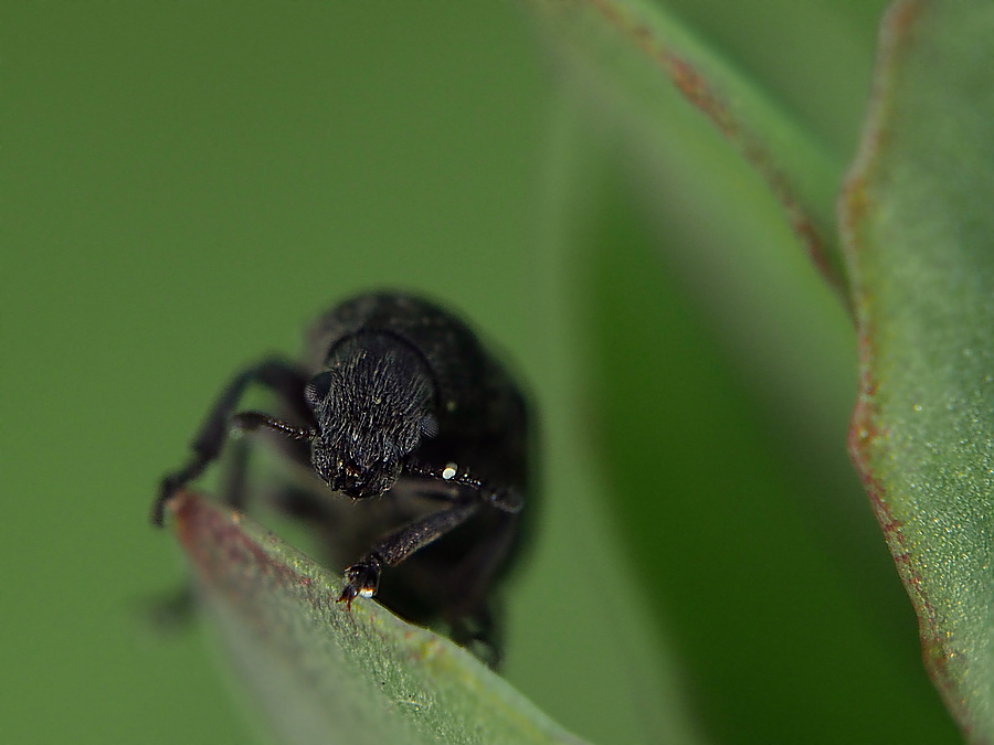Спасибо! Очень мелкий, едва ли длиннее 4-х мм. Сидел у стебля суккулента, спрятавшись. Я пошевелил листик, и он выполз на краешек его, и некоторое время попозировал спокойно. Вот его "мордашка" анфас. Вроде, получается, не долгоносик.