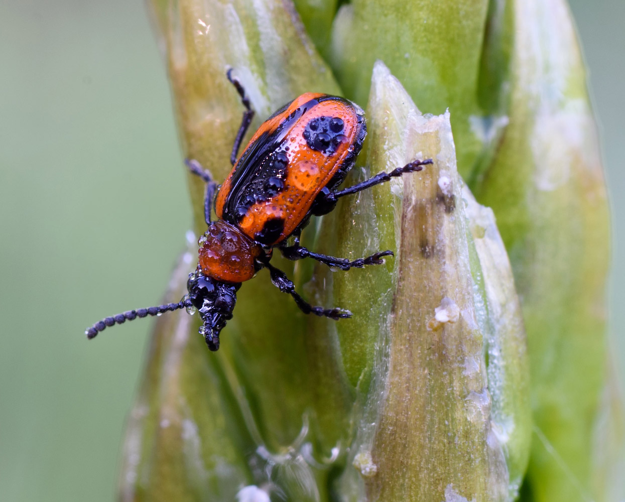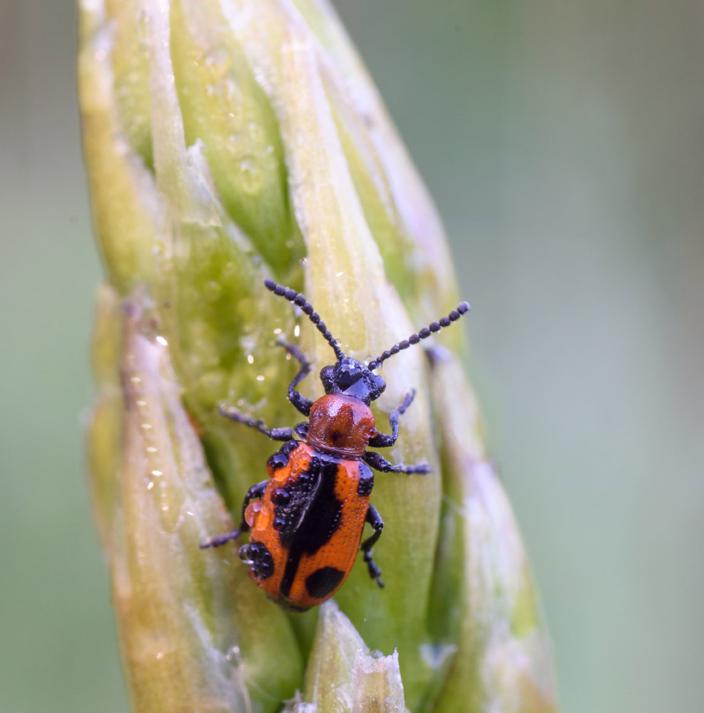 Трещалка пятиточечная (Crioceris quinquepunctata) на роднмо кромовом растении (неведомо каком, только лезет из под земли.. а эти братцы уж тут как тут)