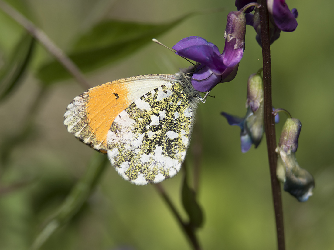 Вроде бы снимал в прошлые годы много, но и в этот год не удержался и "побегал" за этой бабочкой. Это, наверное, как с махаоном - не надоест фотографировать. Хотя, был год, когда махаонов было столько много, что я уже и мимо них проходил. За зорькой на самом деле я не бегал и использовал в прошлом году разработанную тактику. Сижу среди кустиков вот этого растения (мышиный горошек ?) и жду когда бабочки сами прилетят (они по просеке из конца в конец летают и, пролетая мимо этих растений, садятся). Фотографировал с макролинзой, с расстояния в сантиметров двадцать.