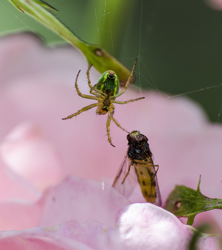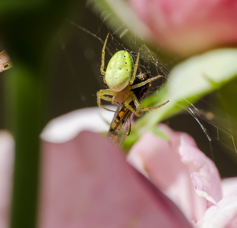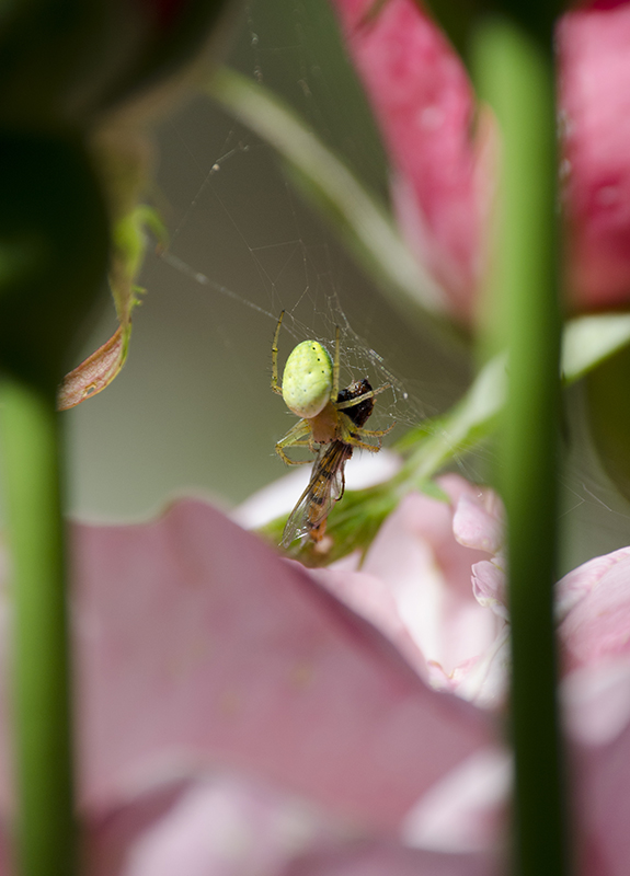 Обнаружил пчелку около 12:00. С несчастной мушкой, паучок разбирался целый день. Но по иронии судьбы, на следующее утро, обнаружил его в цепких лапах другого паучка.
