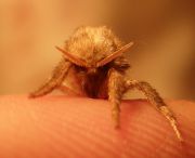 На моём пальце сидит ночной мотылёк, скорее всего шерстолапка стыдливая, но у страха глаза велики - -народ, пытаясь угадать кто это, звал его и летучьей мышью, и комаром, и пауком :-)