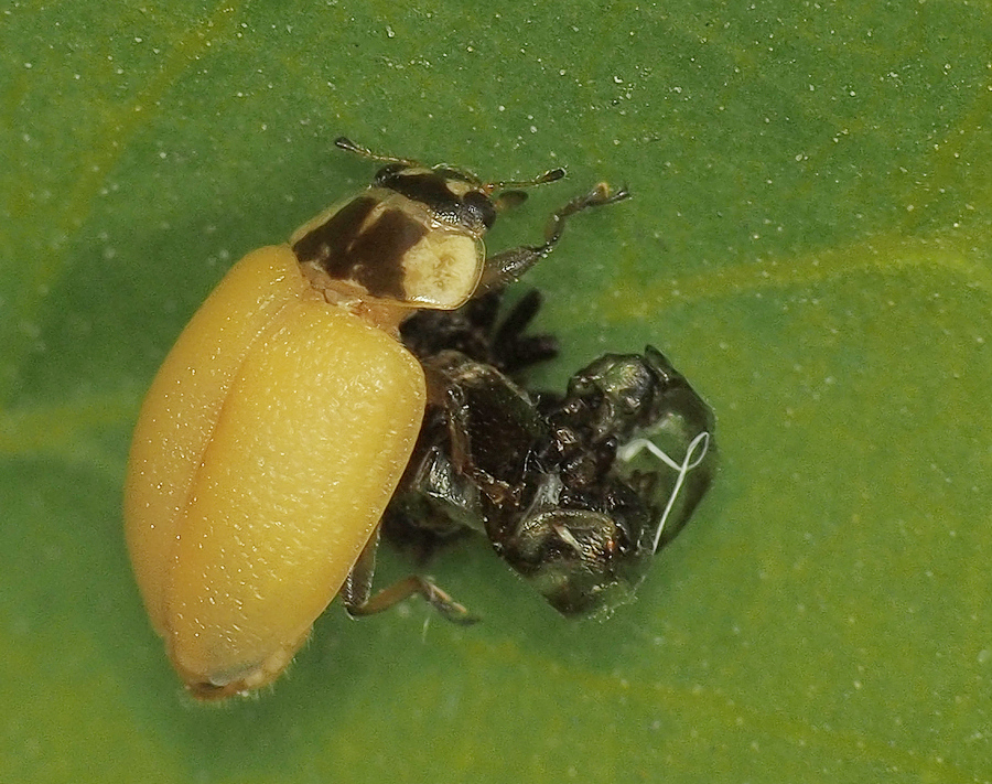 Наблюдая через обьектив за эволюциями неизвестного мне жёлтого жука, не мог понять, что же происходит. Подруга, посмотрев, вскоре, на фото, сказала: - да это же божья коровка! И, точно, это божья коровка вылезала из своей оболочки, и была она ещё непохожей на ту блестящую, с пятнышками, особь, что так известна всем нам. К сожалению, застал я, лишь, финальную стадию процесса. А ведь, незадолго до этого события, заметил я личинку коровки на листике, но не стал её фотографировать-сверху вид был скучно-неинтересным, а изгиб листа не позволил снять личинку в профиль. Спустя некоторое время мы с подругой заглянули в тот уголок, где "родилась" божья коровка. Она (вероятно, она) бегала там же, но уже с пятнышками. Неужели-подумал я, - эта трансформация происходит так быстро?