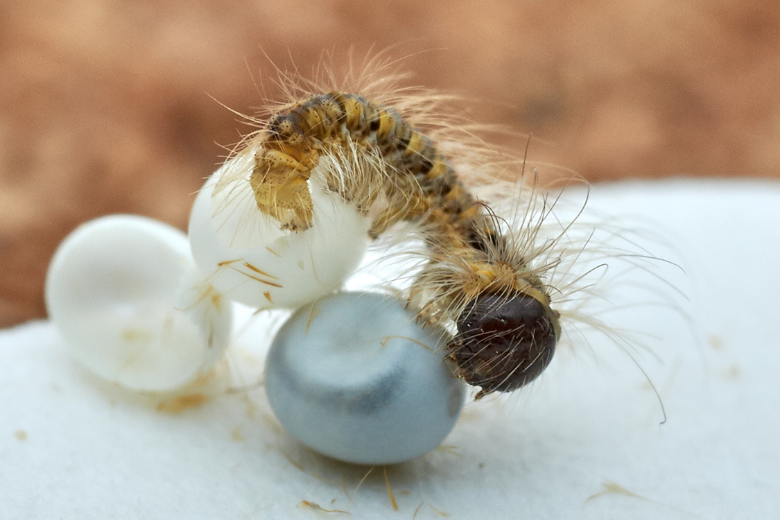 Всё происходит буквально за две минуты. Сначала появляется маленькая дырочка, потом разрастается, по мере поедания гусеницей. После того, как вылезла, обошла скорлупу вокруг и стала её кушать. За качество пардон, на таких масштабах в РИП уместить не смог :-((.