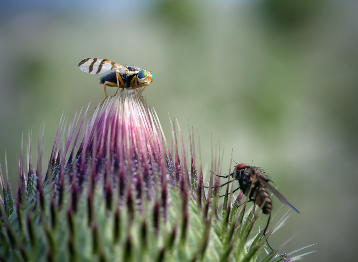 Цветная мушка как оказывалась перед соперницей, сразу же растопыривала крылья, напугать видимо хотела. Что они там находили не знаю, может на иголках что-то есть.