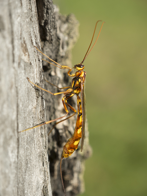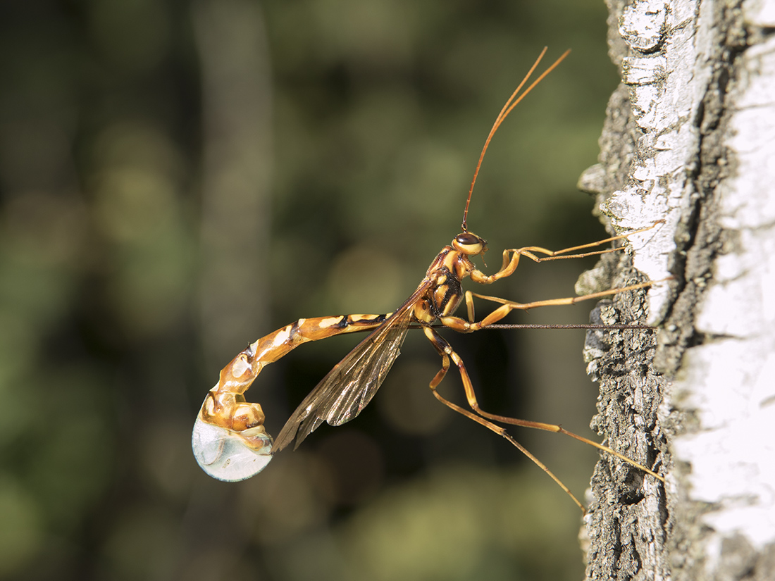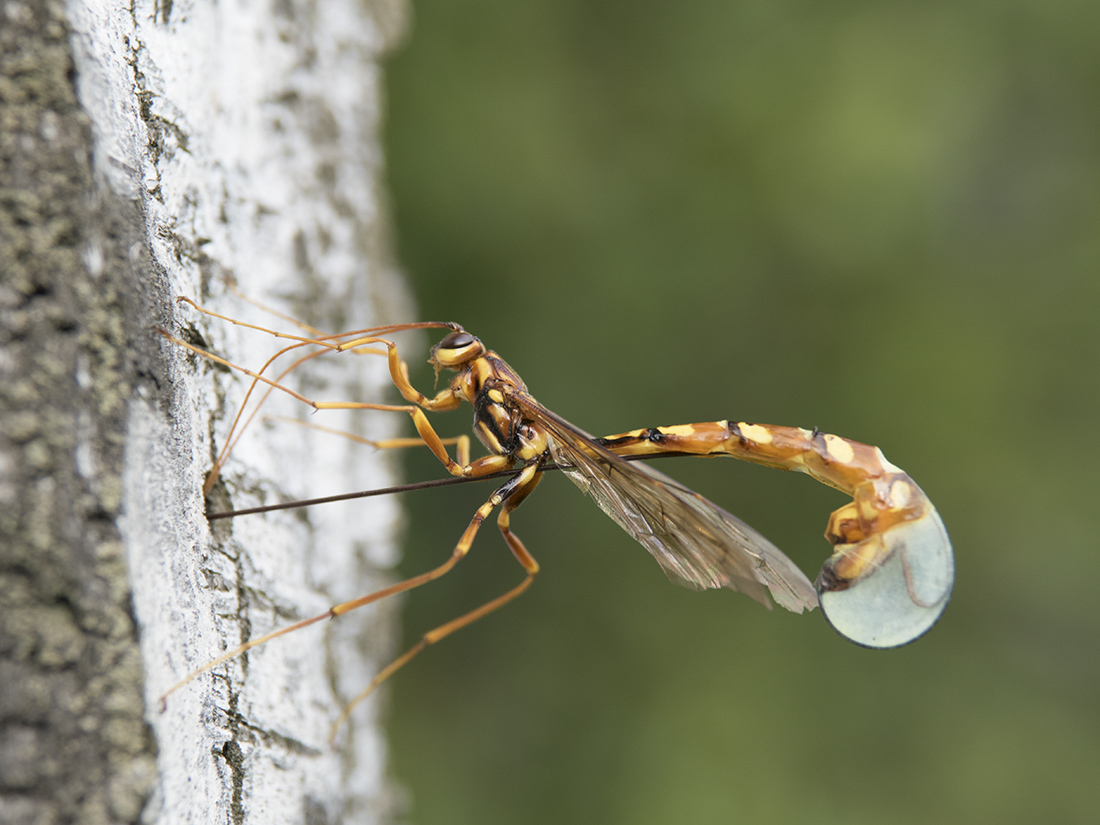 Вроде бы Megarhyssa perlata. Высоко сидела, но я её веточкой пересадил пониже. Покладистая оказалась. Снимал на той же берёзе, где фотографировал месяц назад самку рогохвоста берёзового.