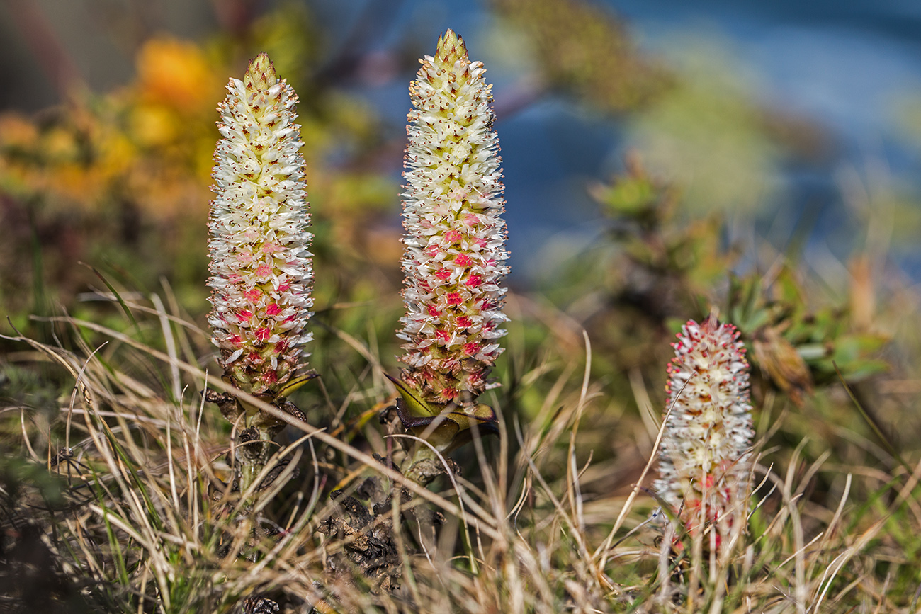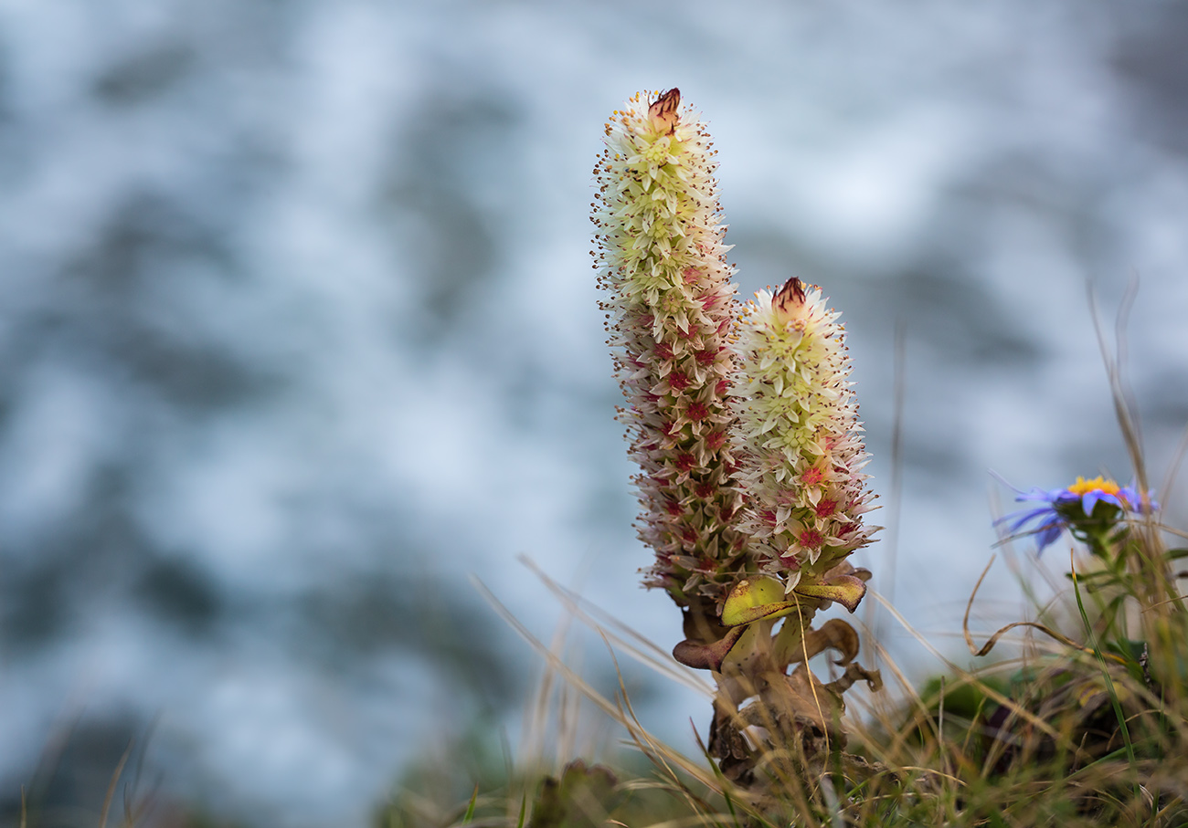 Горноколосник Максимовича (Orostachys maximowiczii). Скромное небольшое растение выделяющиеся среди других только розеткой сочных листьев. Только в сентябре начинают появляться признаки соцветия. К середине сентября они возвышаются над листьями и, наконец, в конце сентября-начале октября зацветают. К этому времени уже мало остается цветов. Разве, что дикие астры, растущие рядом. Снимки делались на о. Рейнеке в период с 8 сентября по 9 октября 2016 г.