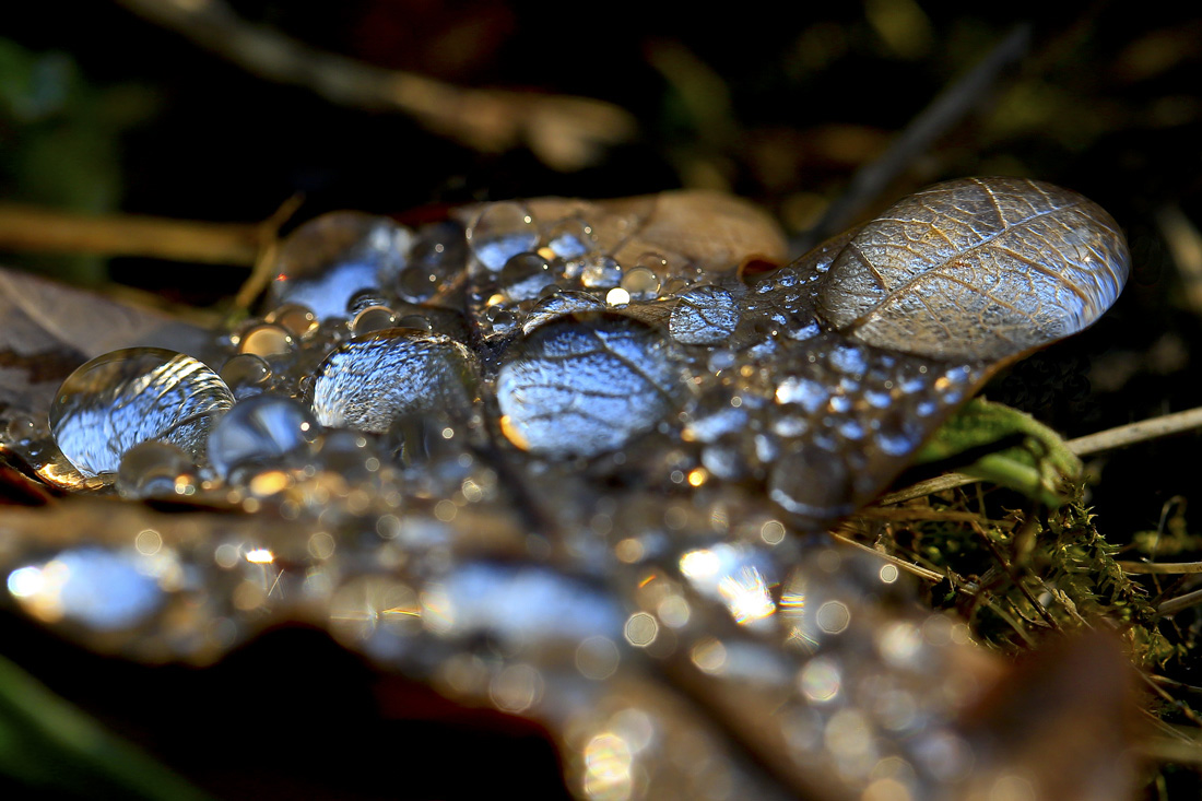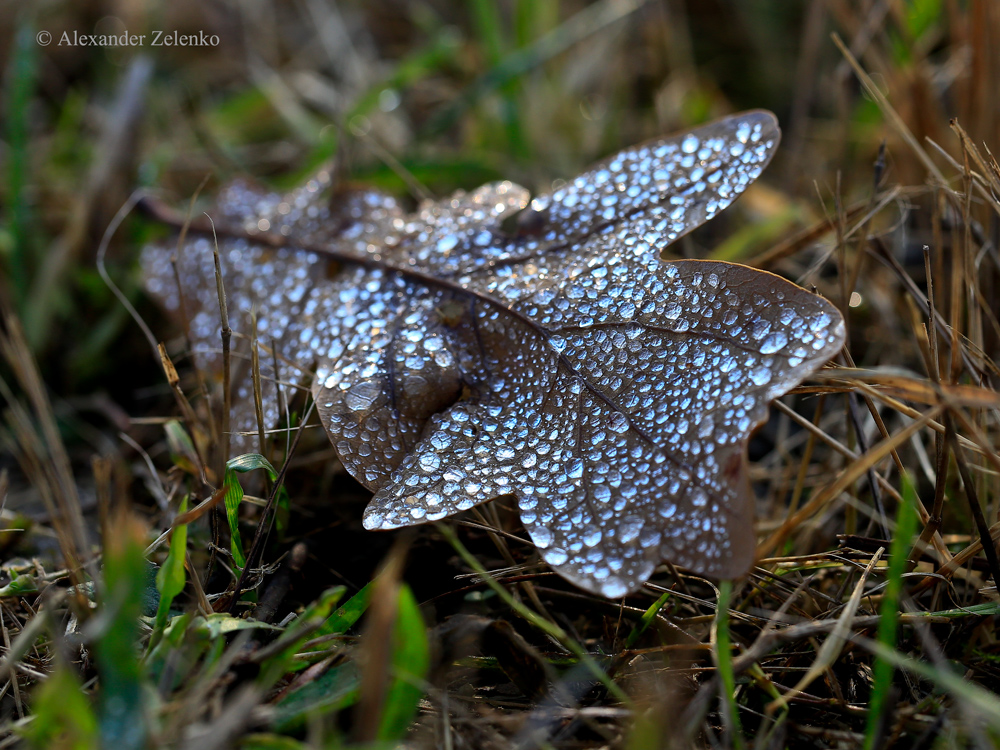 В дополнение. Крупные капли на павших дубовых листьях я заметил впервые. Ни на траве или листьях других деревьев, лежащих на земле, таких капель не было! Причём каплями были покрыты только листья дуба, лежащие на поляне, т.е. на открытом месте, листья же в лесной чаще были совершенно сухими!