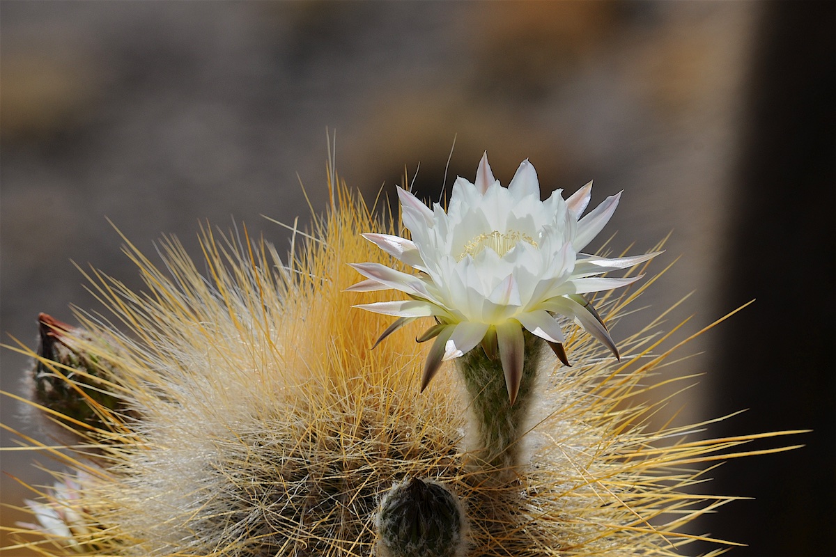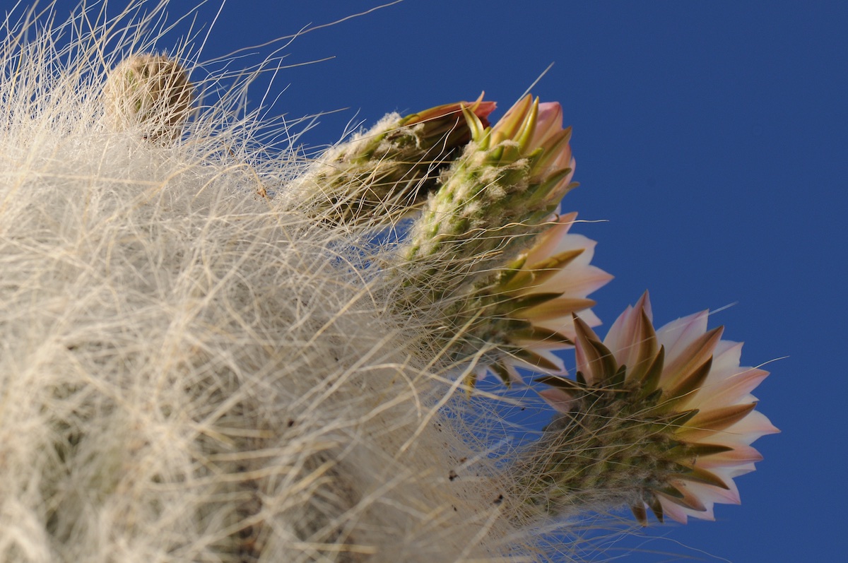 До высоты 2-х метров стебель трихоцереуса покрыт мощными колючками (чтобы альпаки не объедали), а выше защитного пояса уже простирается "теплая" мохнатая "шуба" из волосков и щетинок, из которой и появляются прекрасные цветы.