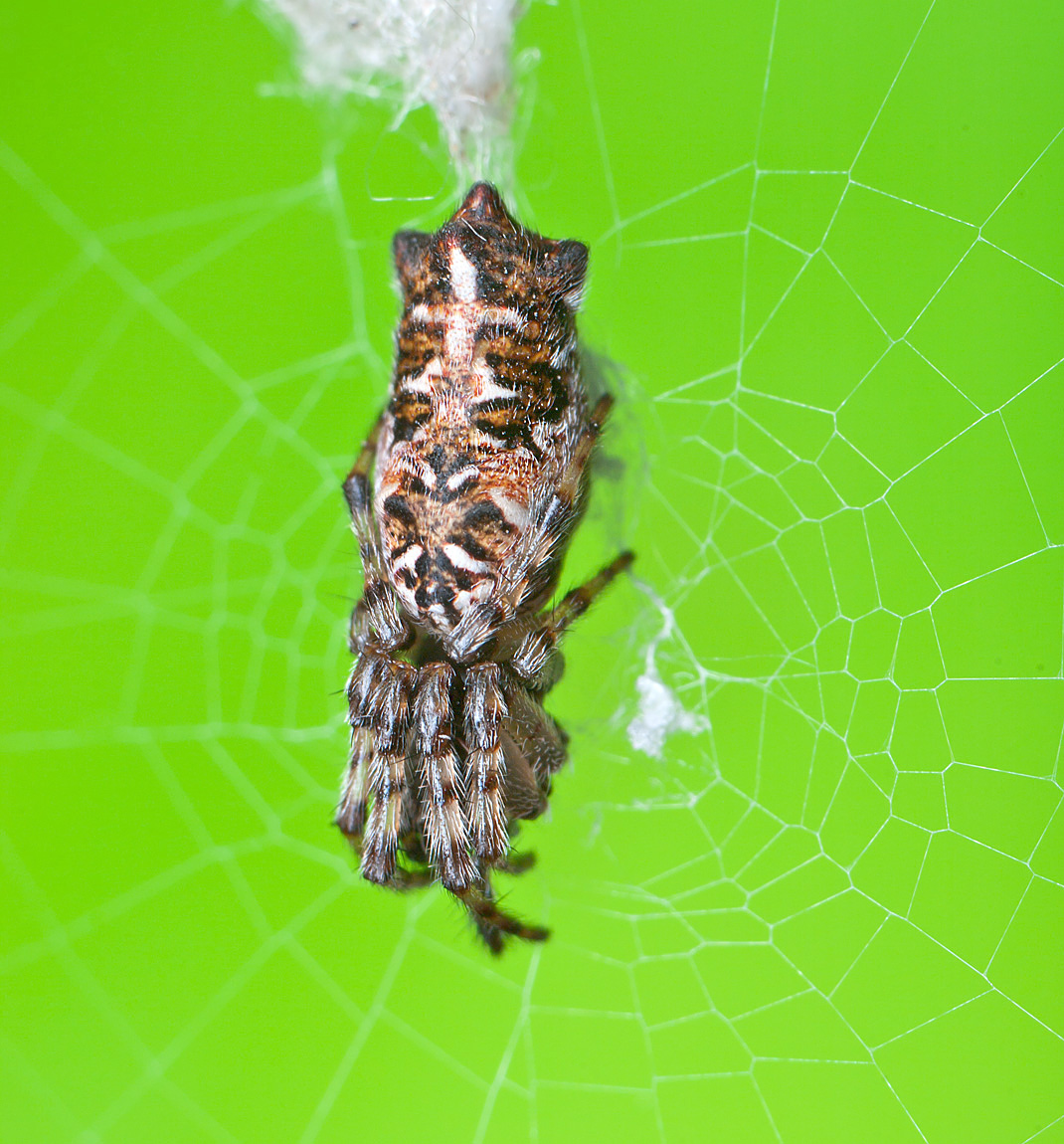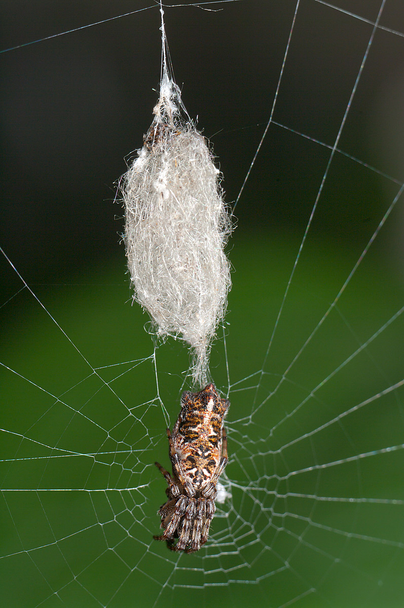 Заметил из своего окна на кусте жасмина, по белому клубку паутины.