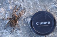 и вид сверху с крышкой от макросотки 58 мм. Сверху поза странная, у меня вызвала бы сомнения, но модель жива, здорова, разве что чуток устала от назойливого преследования, убежала после съемки в нору, которая прикрывалась для возможности съемки