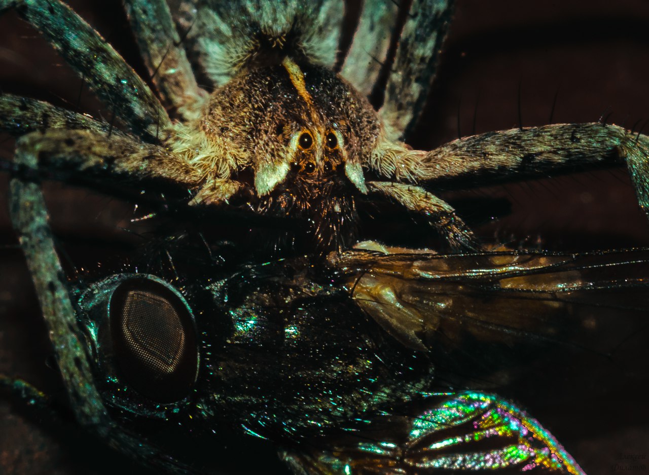 Хищный паук ест муху.