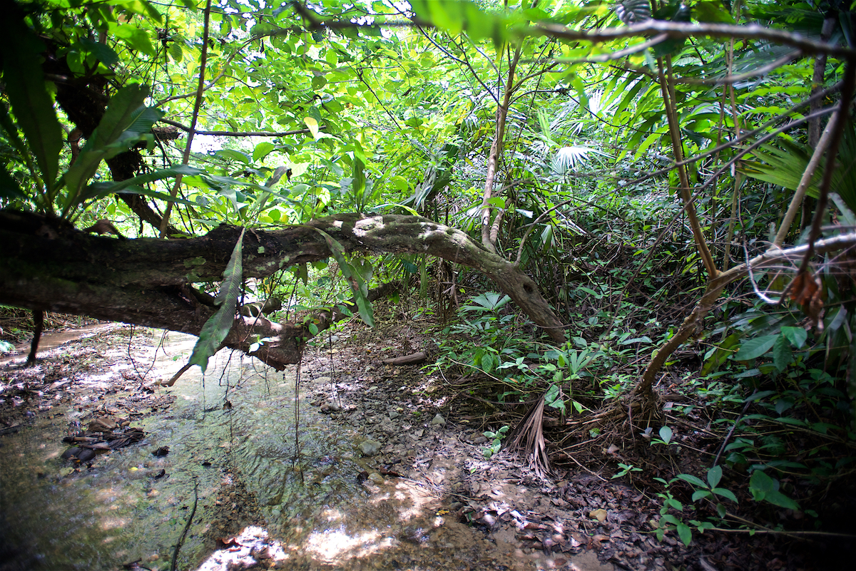 Когда я рассказал про Rio Mariposas Андрею, он конечно захотел отправиться туда ночью, ведь на крутых берегах этого теплого ручья может быть столько неизвестных науке прямокрылых:-)... Он вернулся уже за полночь, я сидел у экрана и ловил на свет, прилетало много чего интересного, но Андрей рассказал о змеях, которых он во множестве встретил там на реке, одна свисала прямо над ручьем, свернувшись в пружину, готовую в любой момент выхватить из воды проплывающую добычу. Этот рассказ меня очень заинтриговал, ведь змеи не прилетают на световую ловушку. На следующий вечер, взяв фонарик помощнее, я отправился на любимую реку, как же там все поменялось. Вместо прекрасных бабочек по берегам сидели "ужасные" фрины, в темноте сверкали глазами пауки-охотники, только змей все не было, но я то знал, что они где то рядом :-) Наконец заметил ее, сидит возле ручья, еще один шаг и змея броском прыгает в ручей и ее сразу уносит течением. Больше мне "не повезло", возвращаюсь в лагерь, иду к экрану проверить светоловушку, у самой земли, вытянувшись во все свои полтора метра и прикинувшись ветошью, лежит змея, спокойная такая, никуда не торопится, но человека отслеживает постоянно. Решил ее не трогать, заняться насекомыми, но через полчаса змея захотела откланяться. Ну нет, так дело не пойдет, нашел сухую ветку, воткнул ее в землю на пути движения рептилии и ... вуаля - змея тут же на нее взабралась, но ветка - не дерево, высоко не уползешь, хотя в кадр все равно не помещается, худая и длинная, как бы компактизировать? Случайно задеваю ботинком за ветку, и змея мгновенно превратилась в сжатую пружину, ну прям как в рассказе Андрея, теперь только снимать :-)